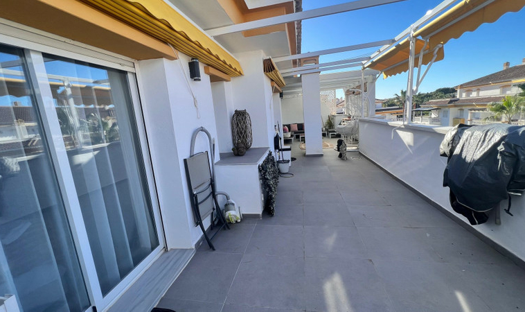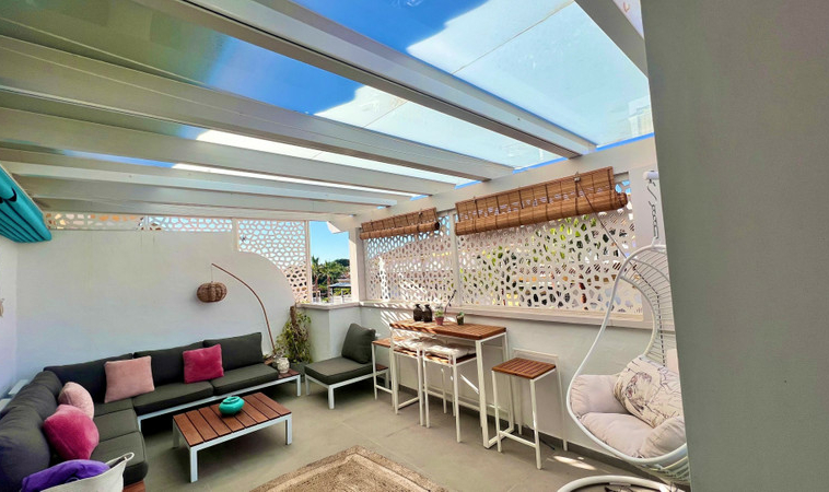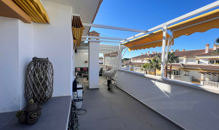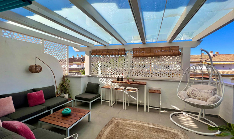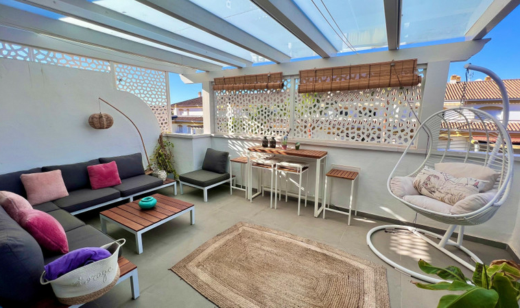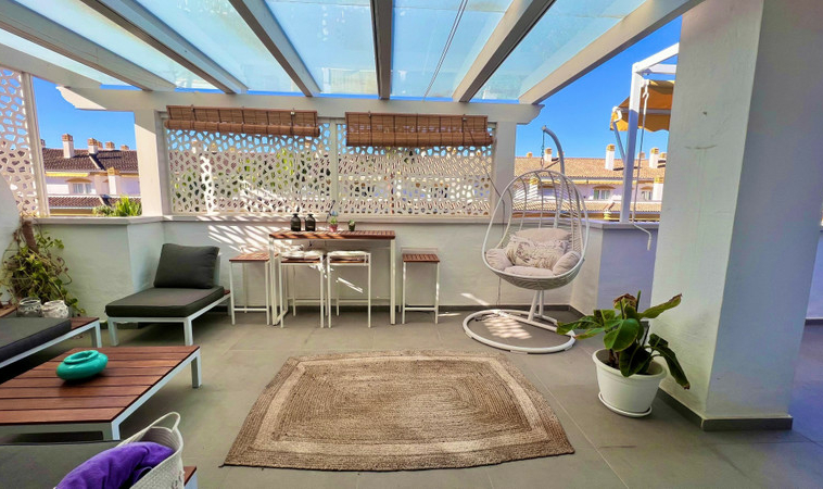 Luminoso ático con amplia terraza perimetral que recorre toda la vivienda, con zona cubierta, vistas abiertas a la montaña y a los cuidados jardines de la urbanización, perfecta para disfrutar de los atardeceres y del clima de la Costa del Sol.