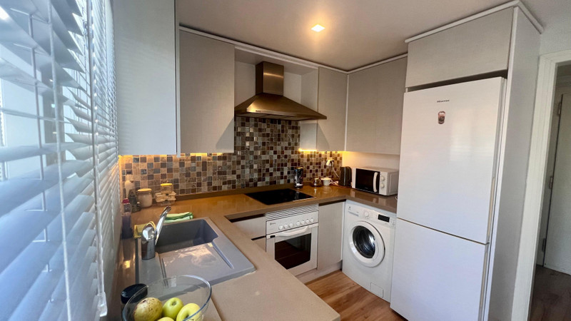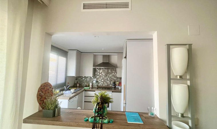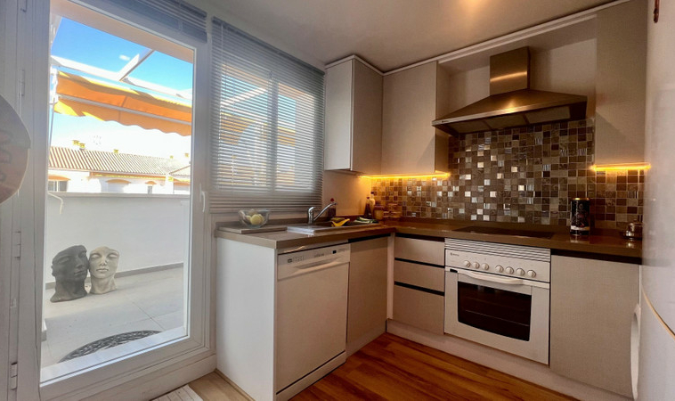 Salón-comedor muy luminoso con acceso directo a la terraza y cocina independiente totalmente equipada, también con salida al exterior, creando una sensación de amplitud y fluidez entre interior y exterior.