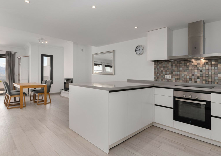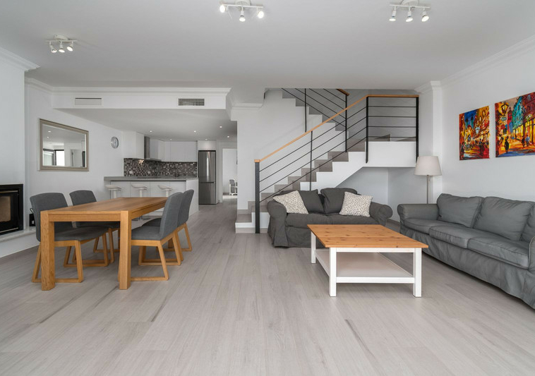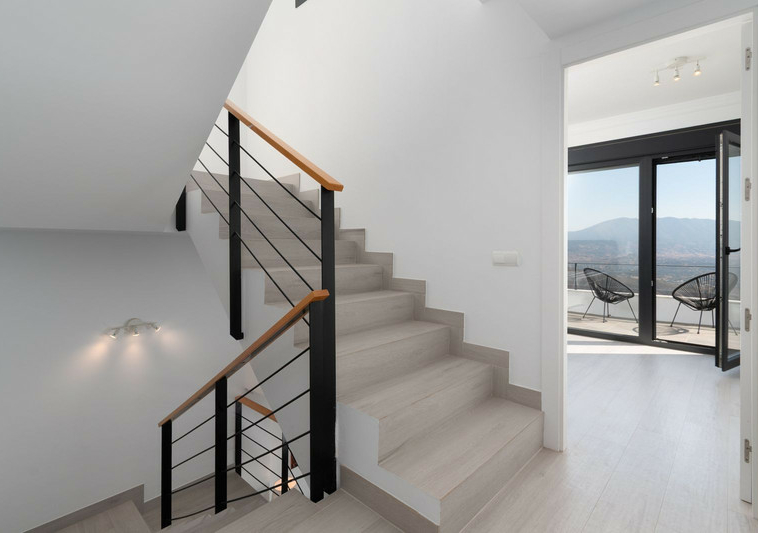 La vivienda está distribuida en varias plantas, comenzando desde el acceso privado en la planta superior. Dispone de cuatro dormitorios y tres baños completos, uno de ellos con bañera y bidet. La zona principal de estar cuenta con un diseño de planta abierta, con un salón-comedor de 35 m², una chimenea moderna y una cocina totalmente equipada con una gran isla central. Desde aquí se accede a una terraza amplia de más de 30 m², ideal para disfrutar de las vistas y de la tranquilidad del entorno.
