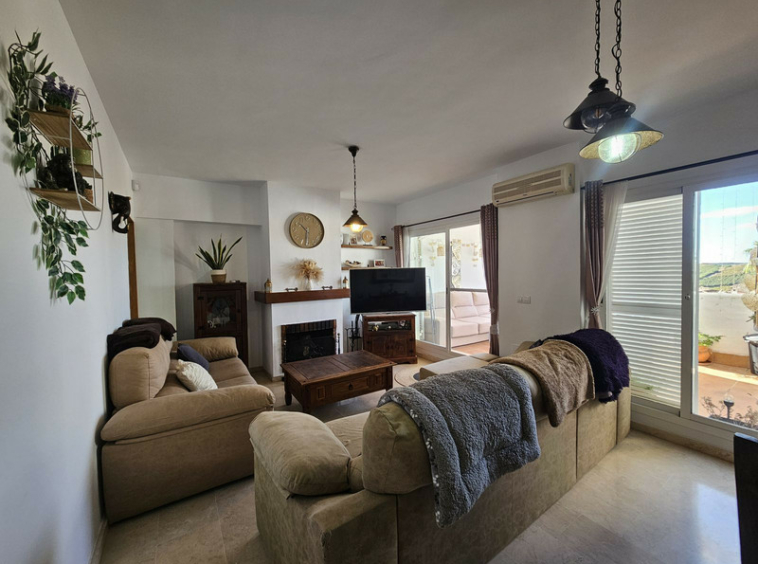 Desde la terraza, una escalera de caracol conduce a la azotea. La terraza acristalada de 33 m² es ideal para hacer una barbacoa o tomar el sol. Desde todas las plantas de la vivienda se disfruta de las preciosas vistas a la montaña de Manilva, y desde la terraza se aprecia el mar.