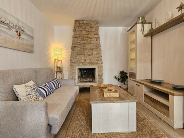 La sala de estar es luminosa y espaciosa gracias a sus grandes ventanales que abren hacia una amplia terraza orientada al sur y suroeste, con hermosas vistas al mar.
