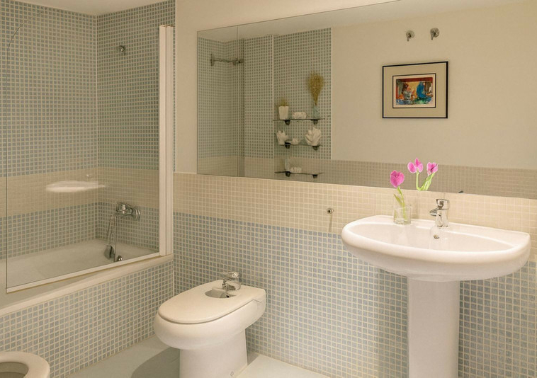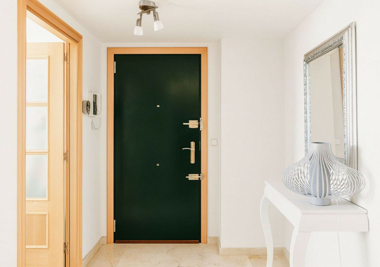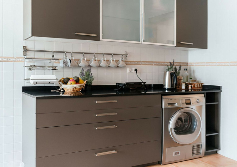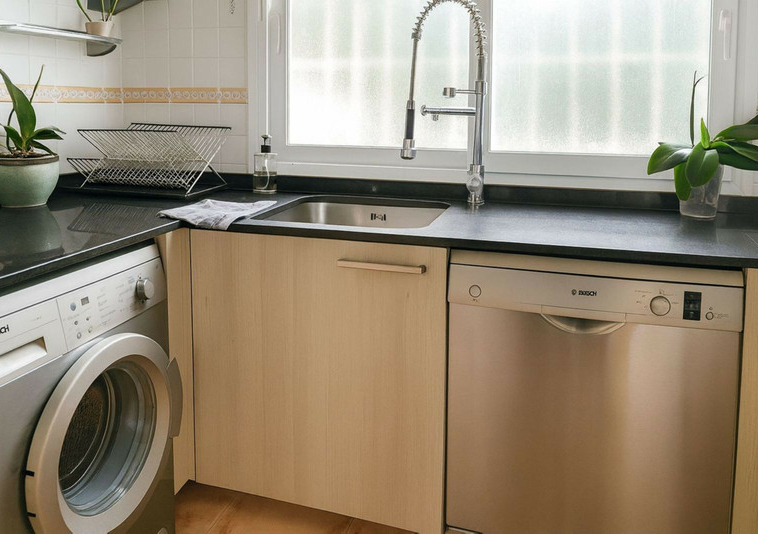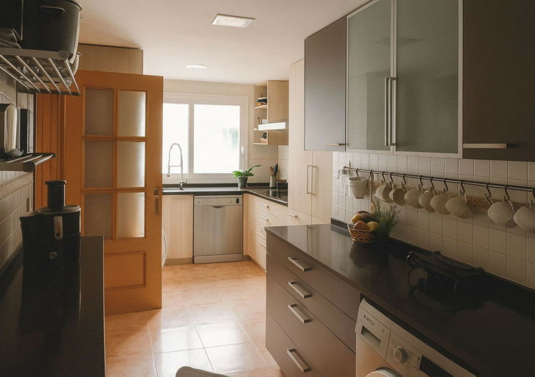 El apartamento tiene una distribución práctica: la cocina queda a la izquierda, totalmente equipada con electrodomésticos de buena calidad, ideal para el día a día.