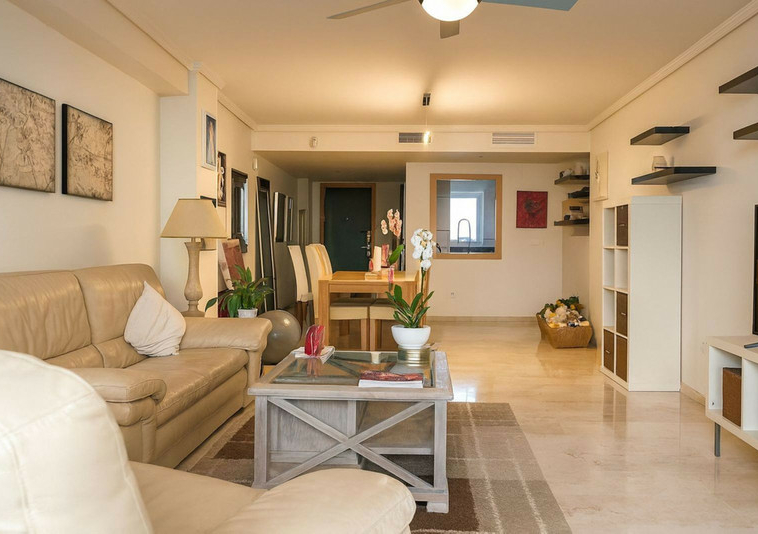 Avanzando, se accede a un amplio salón con espacio suficiente para zona de estar y comedor. Los grandes ventanales/puertas correderas conectan con una amplia terraza, con vistas a los jardines comunitarios.