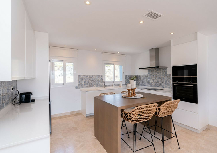 entre las estancias interiores y las exteriores. La cocina abierta e integrada al salón, cuenta con electrodomésticos de alta gama Siemens y está equipado con sistema de domótica para las instalaciones, la iluminación y las