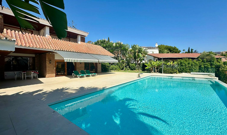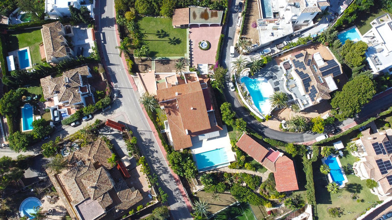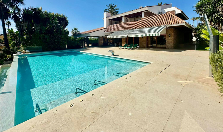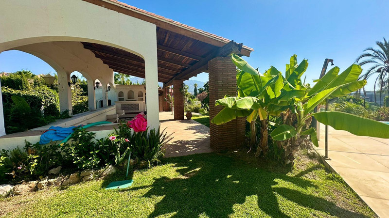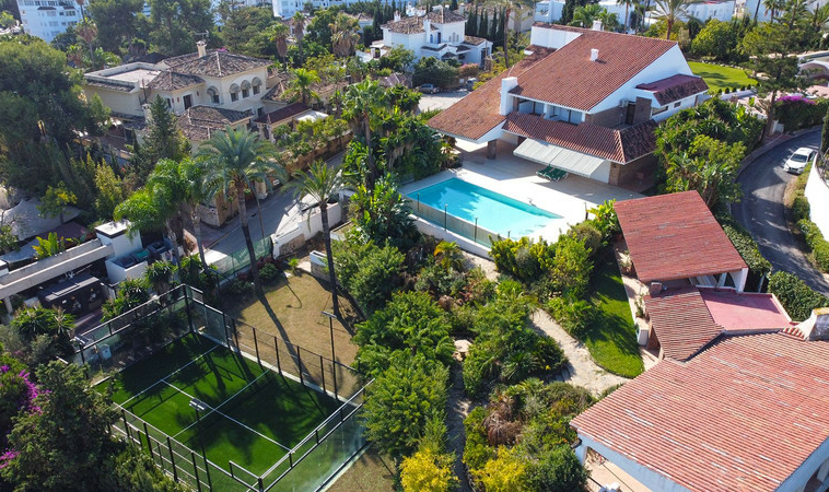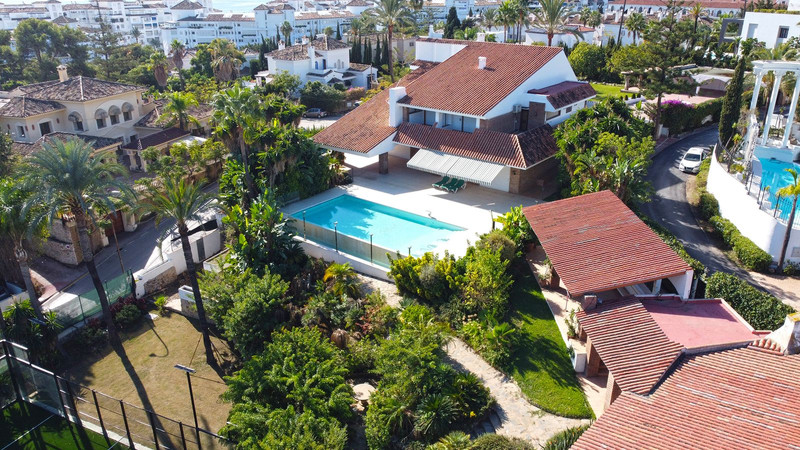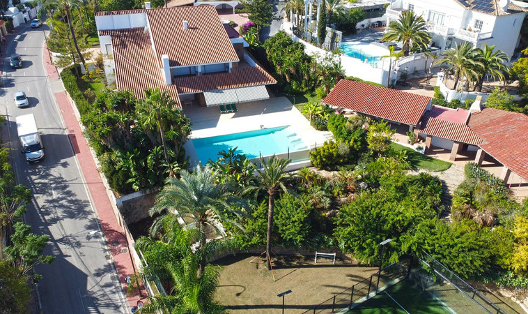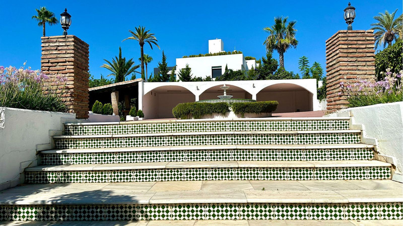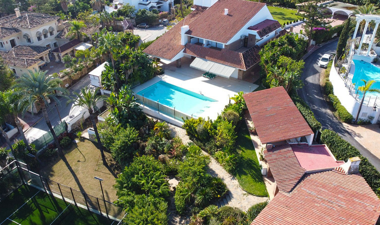 Gran villa en buen estado de conservación, con una superficie construida total de 834 m2 más 573 m2 de terrazas y porches sobre parcela de 4.348 mt2. Construida en 1981. Orientada hacia el Este. La edificación principal consta en planta baja de gran hall de entrada, aseo de invitados, gran salón en 2 alturas, comedor independiente, cocina, cuarto de estar con salida a terraza, un dormitorio con cuarto de baño en suite con salida independiente y acceso de servicio. En planta alta consta de cuarto de estar, segundo dormitorio con salida a balcón y cuarto de baño en suite, tercer dormitorio con cuarto de baño en suite, cuarto dormitorio con salida terraza con magníficas vistas a la Concha y al mar, y gran suite principal compuesta de dormitorio, vestidor y gran cuarto de baño y terraza con vistas. Gran zona de aparcamiento y garaje para 5 vehículos, Otras edificaciones constan de garaje para un vehículo y dormitorio con baño para el chofer y dormitorio con baño para el servicio y cuarto lavandería. Gran zona bar barbacoa con amplia terraza cubierta. Infinity pool. Pista de Paddle. Preciosos jardines con gran número de arboles.