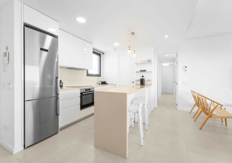 La cocina está equipada con electrodomésticos de alta gama y conectada directamente a ella se encuentra una despensa independiente con espacio para lavadora y almacenaje.