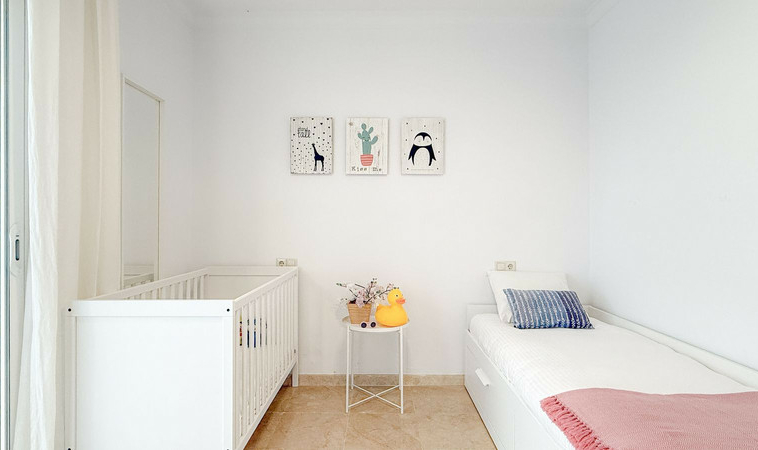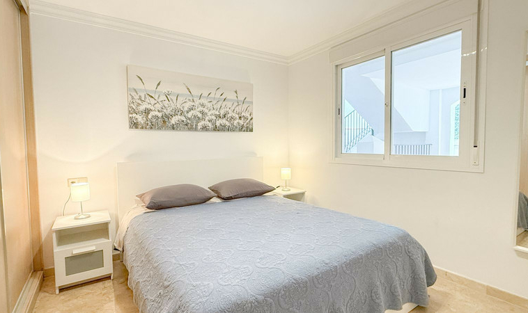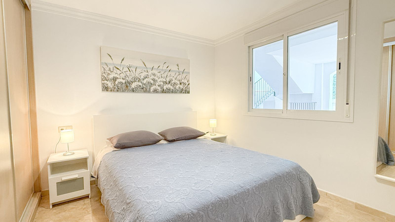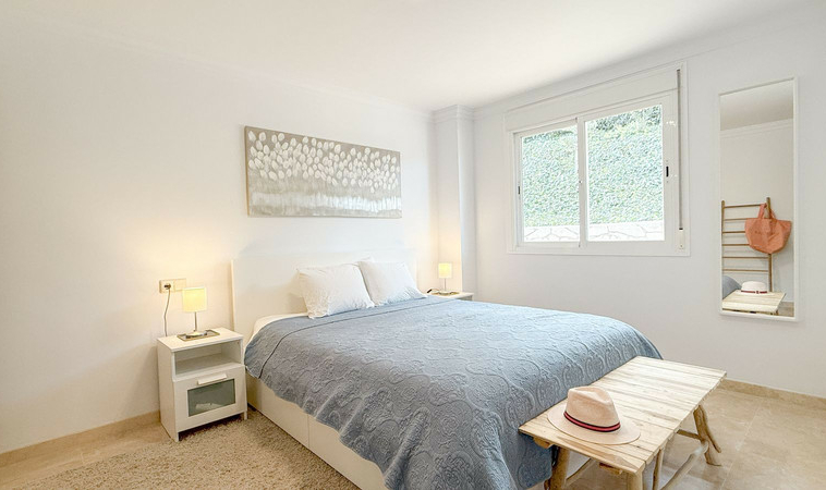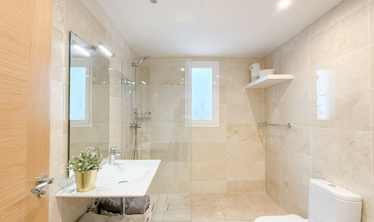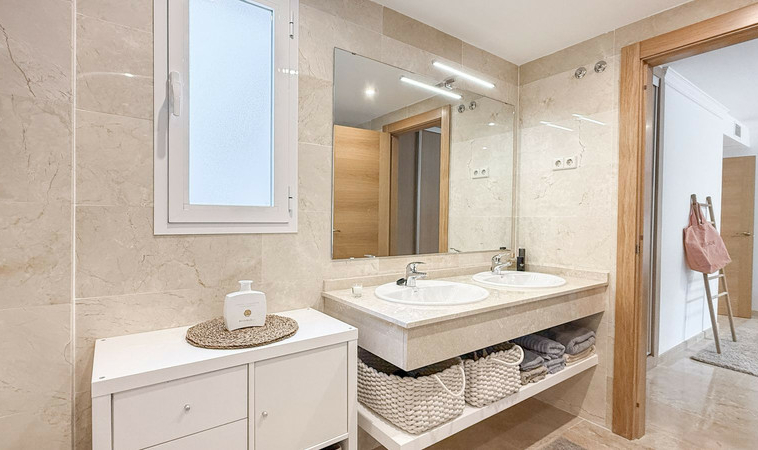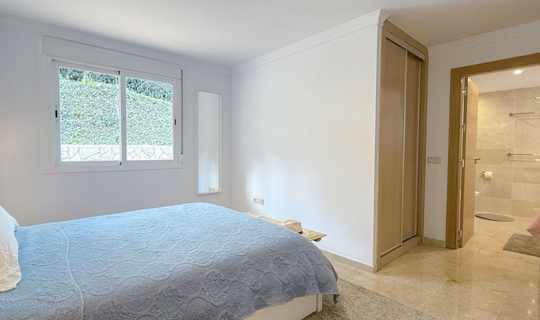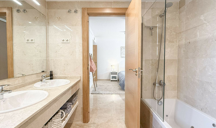 El amplio dormitorio principal tiene su propio cuarto de baño con bañera y ducha. Los otros dos dormitorios comparten un segundo cuarto de baño con ducha y uno de ellos tiene otra terraza privada.Este apartamento cuenta con 2 plazas de aparcamiento en el garaje subterráneo y un trastero. La urbanización, muy bien cuidada y segura, ofrece una preciosa piscina infinita y un soleado jardín, así como una sauna.