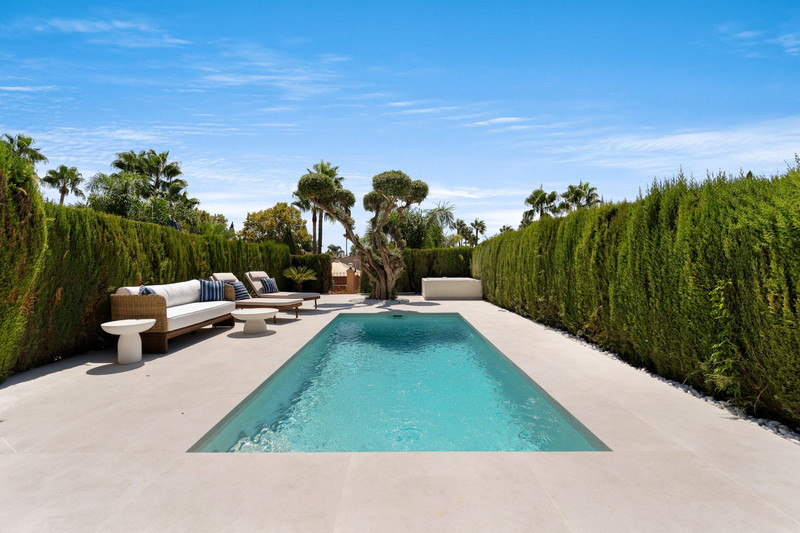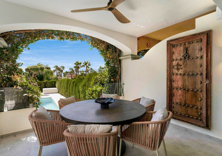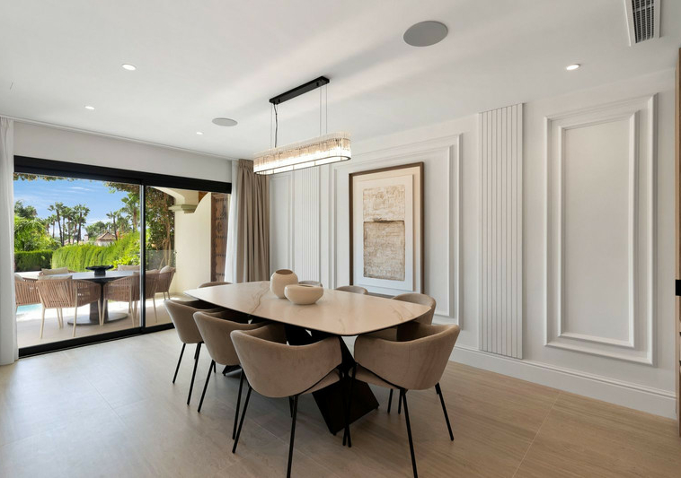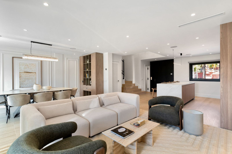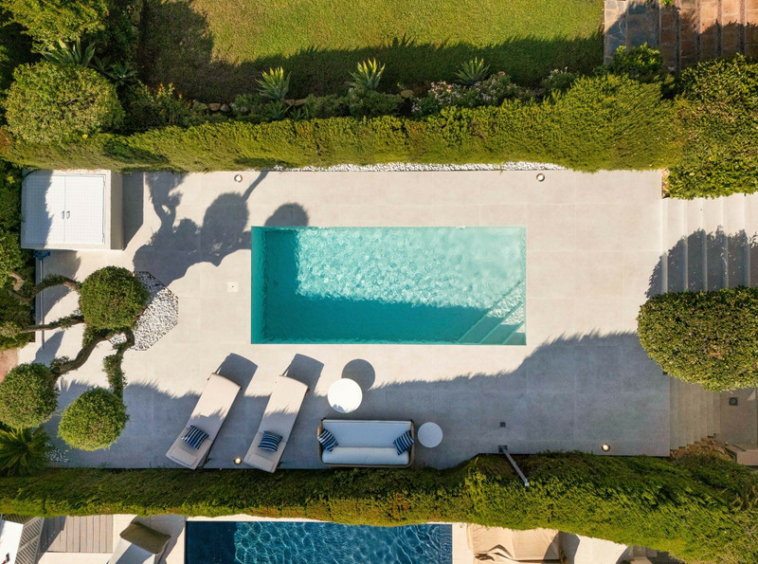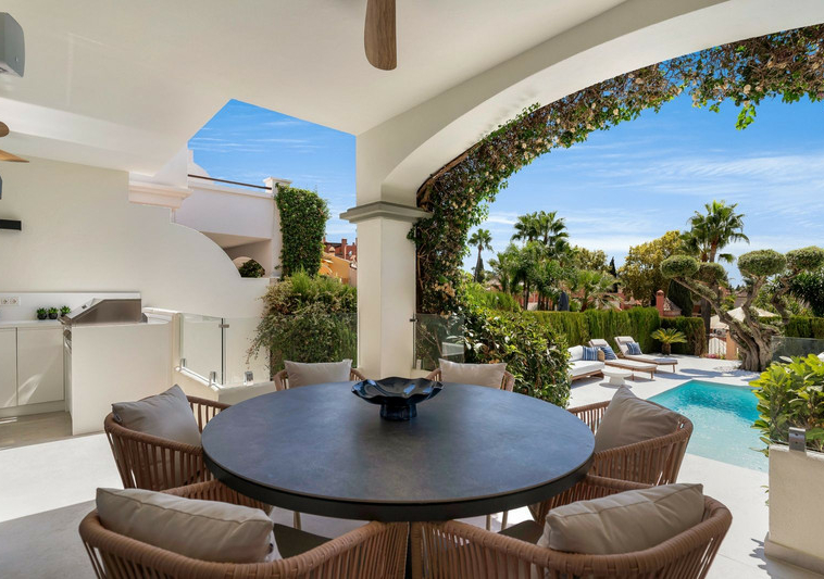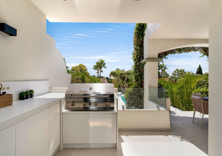 La planta baja se abre a la terraza del jardín, que cuenta con un comedor adicional y una cocina exterior (una cocina de Corian blanco mate totalmente sólida y hecha a medida, con barbacoa, fregadero y nevera), complementada con una mesa de comedor para ocho personas, el espacio exterior ideal para el entretenimiento. Al salir al jardín, le espera una piscina climatizada de agua salada con asientos adicionales y tumbonas.