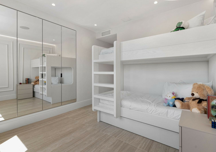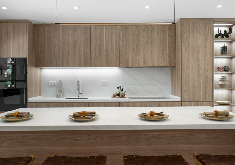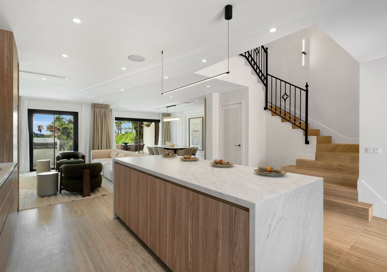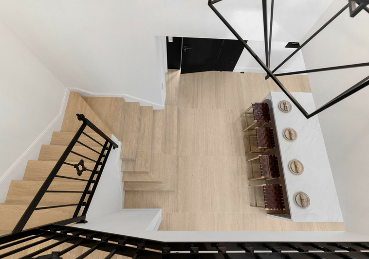 Consta de tres niveles. La planta baja, con una distribución diáfana entre la cocina, el comedor y la sala de estar, ofrece un espacio sociable y fácil de usar. Una cocina de alta calidad y bellamente diseñada, con encimeras de porcelana a juego, electrodomésticos Gaggenau y calefacción por suelo radiante. Un comedor formal con capacidad para 8 personas y una acogedora sala de estar, complementada con muebles hechos a medida y exclusivos para este proyecto, completan esta planta.