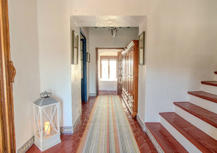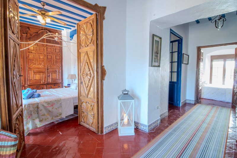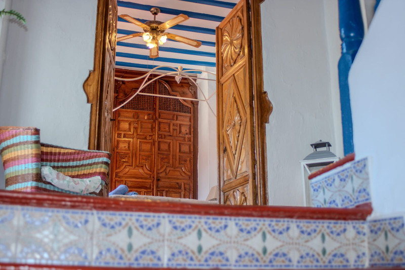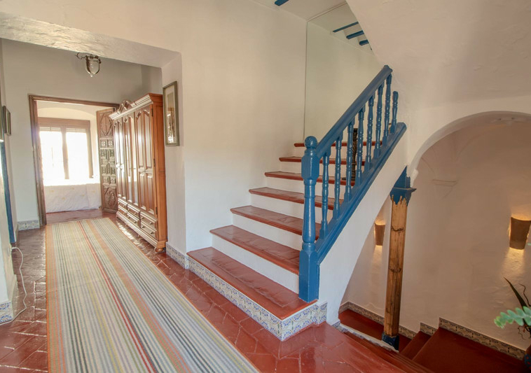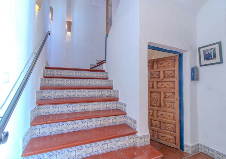 En la planta superior, una preciosa escalera de baldosas conduce a tres amplios dormitorios dobles, cada uno con un carácter único. El primero cuenta con armarios antiguos tallados, mientras que el segundo y el tercero comparten un elegante cuarto de baño compartido. Los espacios luminosos y los detalles de diseño tradicional crean un ambiente acogedor en toda la vivienda.