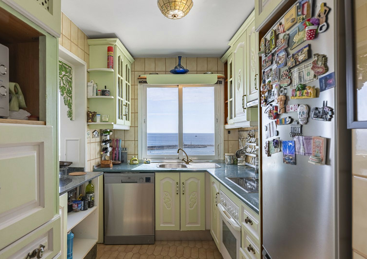 La cocina, independiente y de diseño contemporáneo, ofrece una perspectiva casi cinematográfica del mar. Cocinar aquí no es una rutina, sino un acto de inspiración.