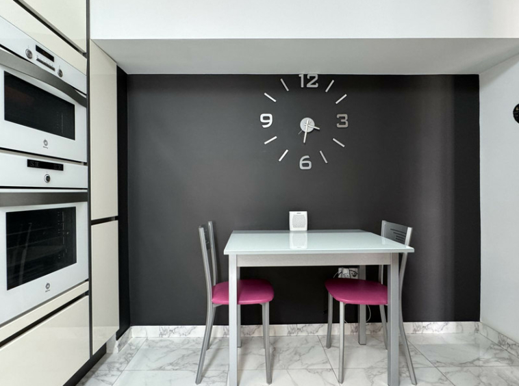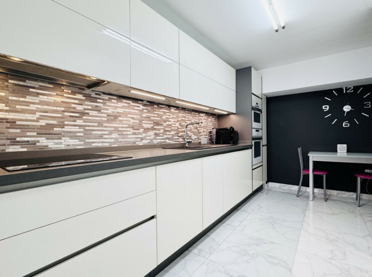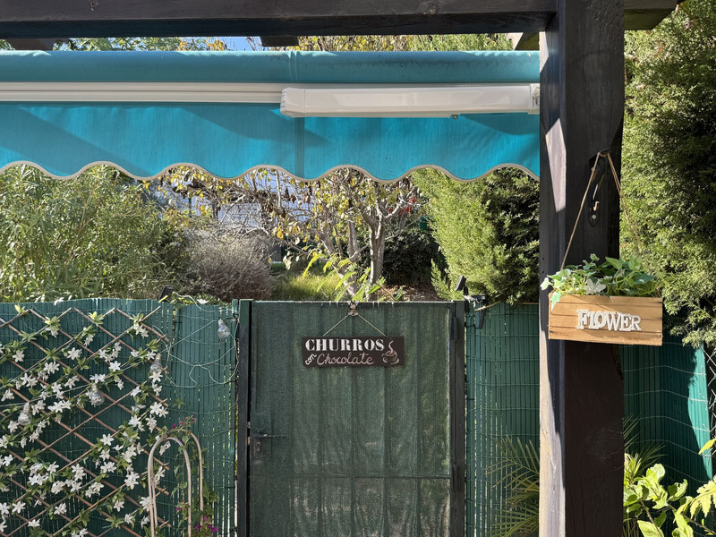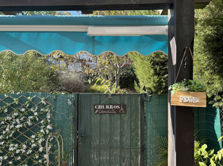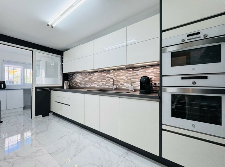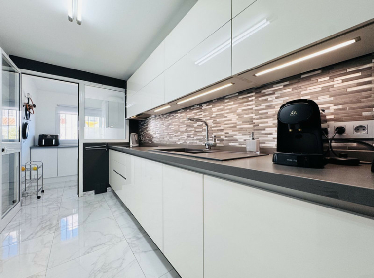 En la planta principal se encuentra una amplia y moderna cocina totalmente equipada, con elegantes muebles blancos de acabado brillante, gran capacidad de almacenaje y un lavadero independiente. También hay un aseo de cortesía. El salón-comedor de planta abierta cuenta con una acogedora chimenea y puertas francesas que dan acceso a una soleada terraza y jardín orientados al oeste, con toldo para sombra y salida directa a los jardines y la piscina comunitaria.