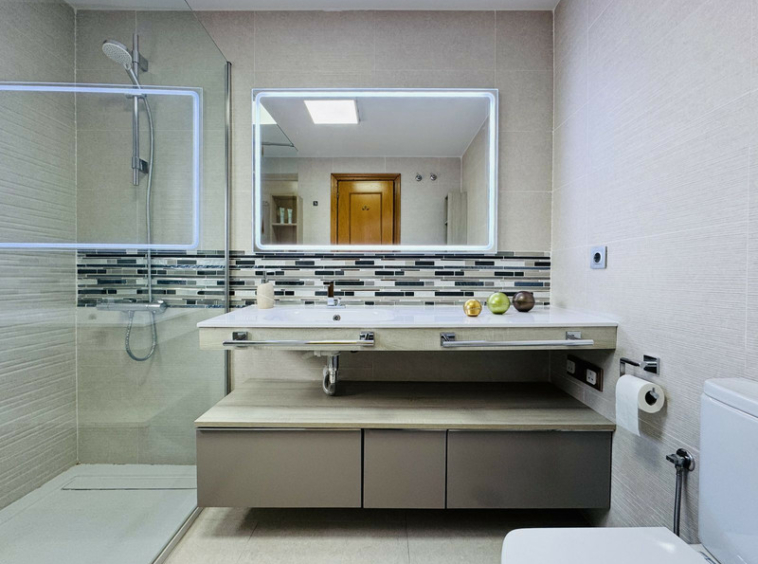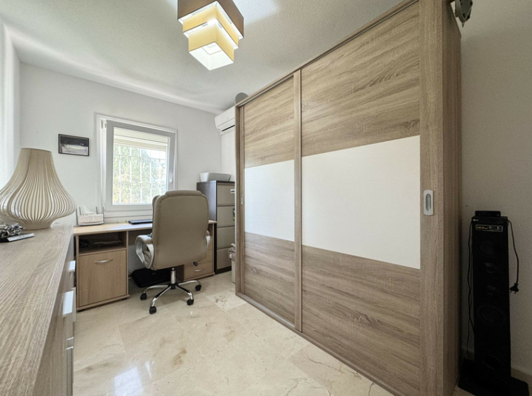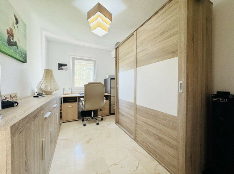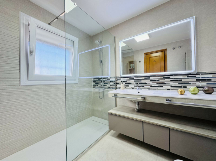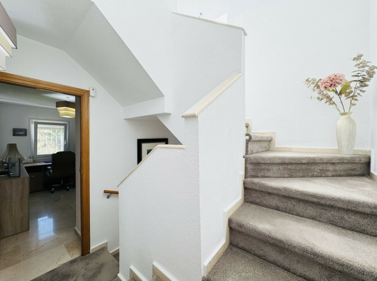 En la primera planta se encuentran tres amplios dormitorios dobles, todos con armarios empotrados. El dormitorio principal dispone de baño en suite completamente renovado, con una moderna ducha a ras de suelo, mientras que un segundo baño completo da servicio a los otros dos dormitorios. El salón y dos de los dormitorios cuentan con aire acondicionado individual frío/calor, para garantizar el confort durante todo el año.
