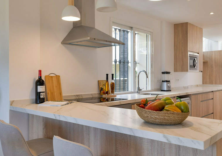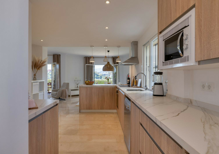 La cocina, recientemente renovada, se complementa con elegantes suelos de mármol, baños modernizados y un diseño interior con estilo que crea un ambiente armonioso y sofisticado. La terraza privada sirve como una extensión del espacio habitable y ofrece hermosas vistas a la montaña, ideal para relajarse, comer y socializar.