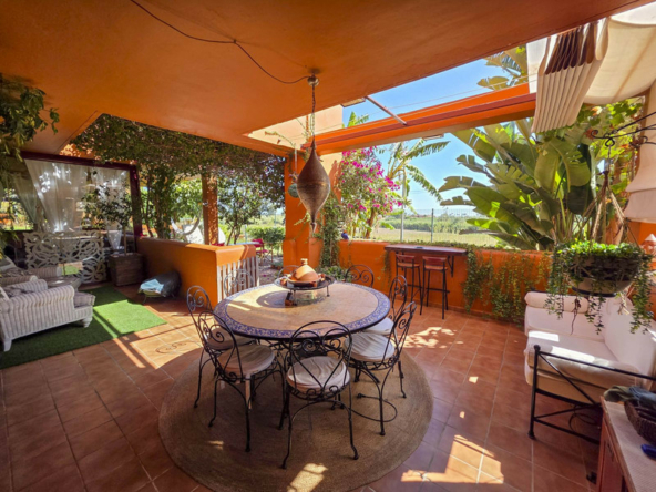 Ubicada en una tranquila y exclusiva urbanización, esta encantadora propiedad en planta baja ofrece una calidad de vida excepcional. Con un amplio jardín delantero que brinda vistas al mar, esta vivienda es ideal para quienes buscan confort, privacidad y una conexión directa con la naturaleza. El interior se distribuye en un luminoso salón con cocina moderna integrada, creando un ambiente abierto y acogedor. Además, cuenta con dos habitaciones, la principal con salida directa al jardín trasero, un baño y una segunda habitación con bonitas vistas al mar.