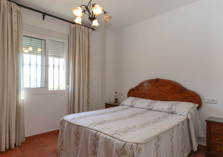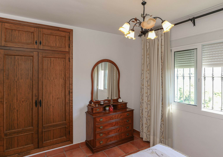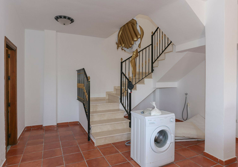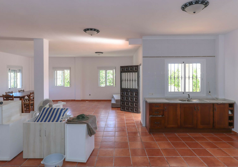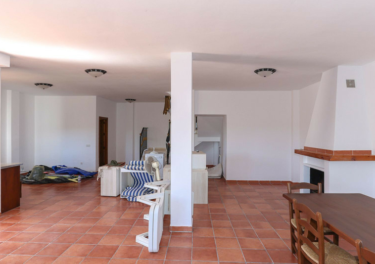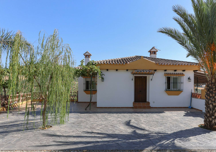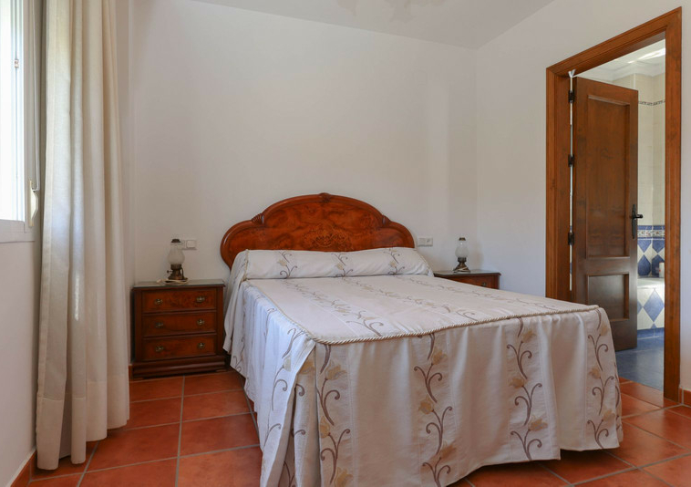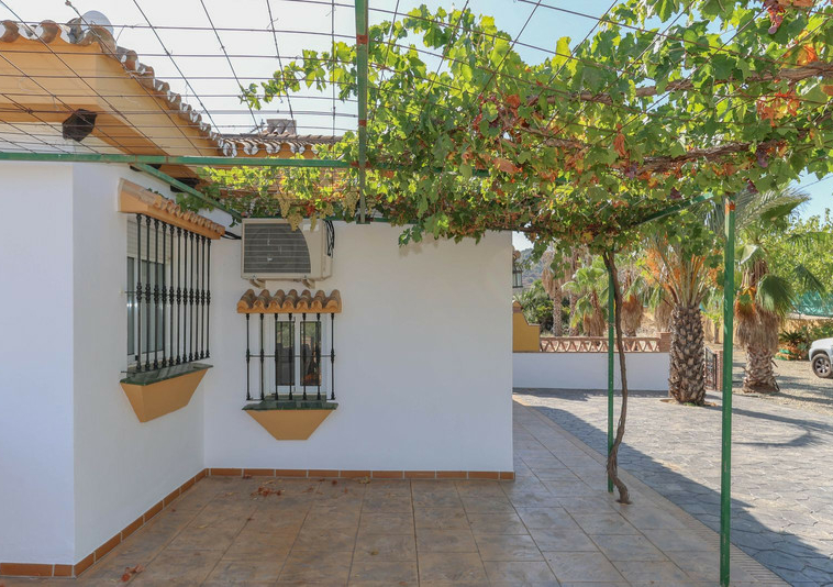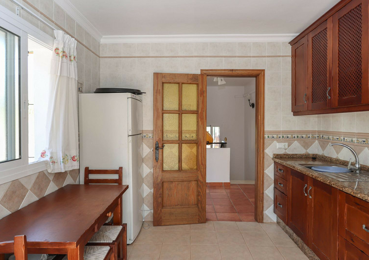 La casa se distribuye en dos plantas. En la planta baja se encuentra la casa principal, una propiedad de tres dormitorios y dos baños. El salón y la cocina tienen acceso a la terraza con sombra y vistas a la piscina.