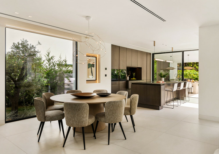 Desde el primer momento, la villa impresiona con su llamativa arquitectura moderna y su imponente puerta de cristal, enmarcada por ventanales de suelo a techo que inundan los interiores de luz natural. Un majestuoso olivo centenario preside la entrada, un sutil homenaje a la armonía entre el diseño contemporáneo y la belleza de la naturaleza.