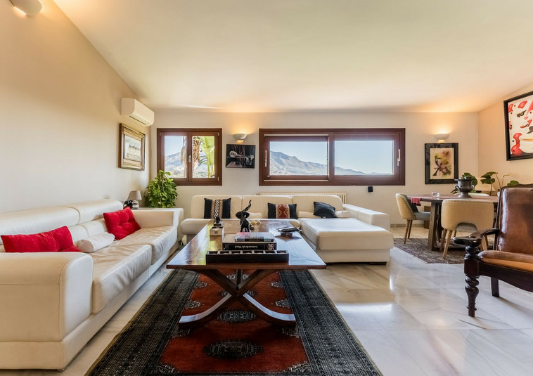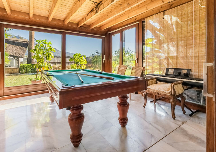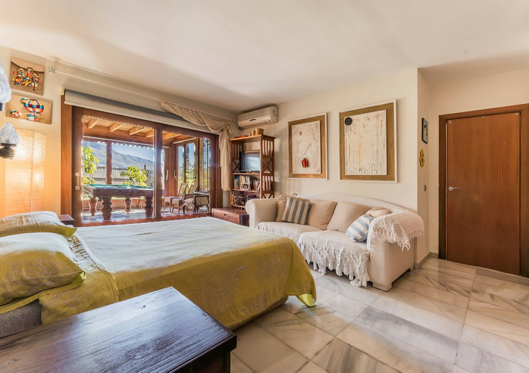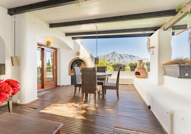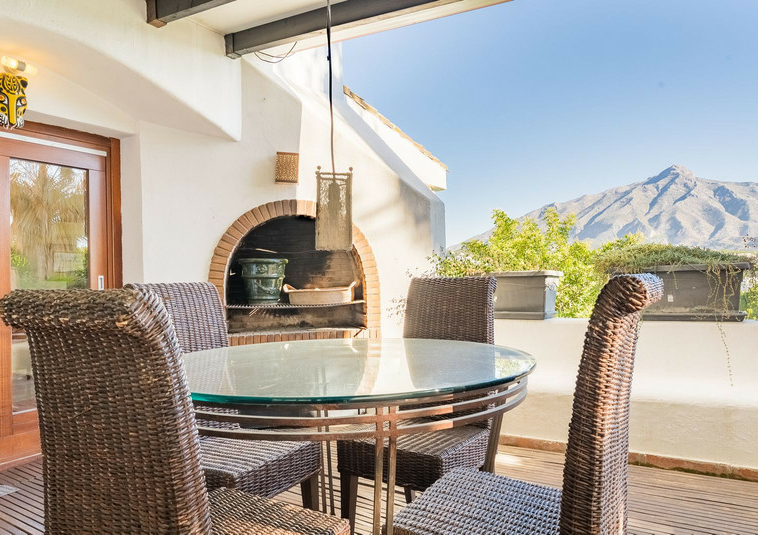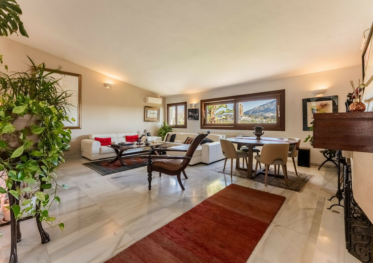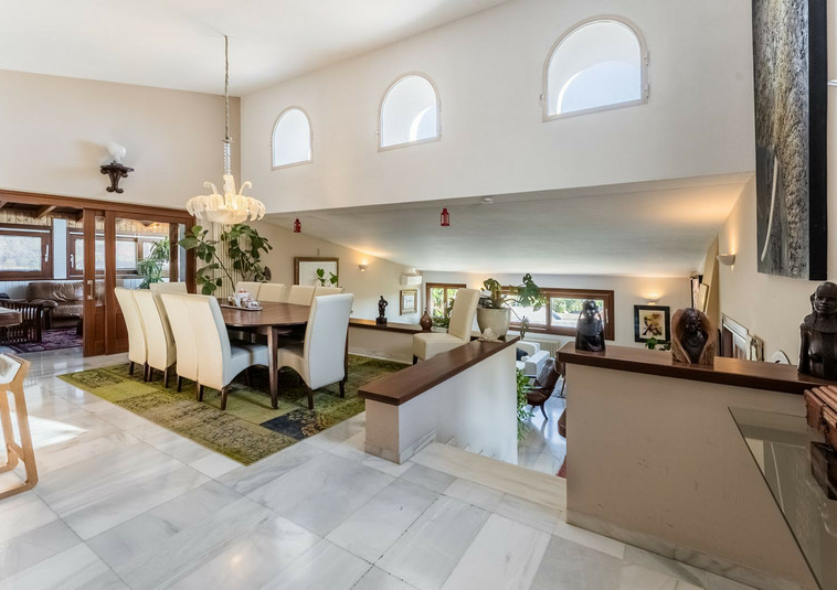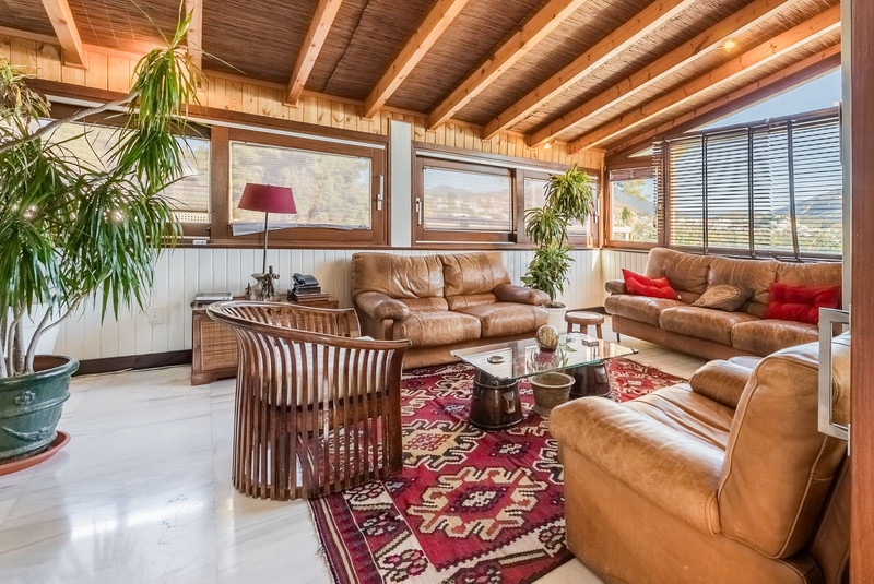 – Segundo nivel: Un gran salón principal que se abre a una amplia terraza cubierta con zona de estar y barbacoa, disfrutando de vistas panorámicas al jardín, piscina, montañas y Marbella paisaje urbano.
