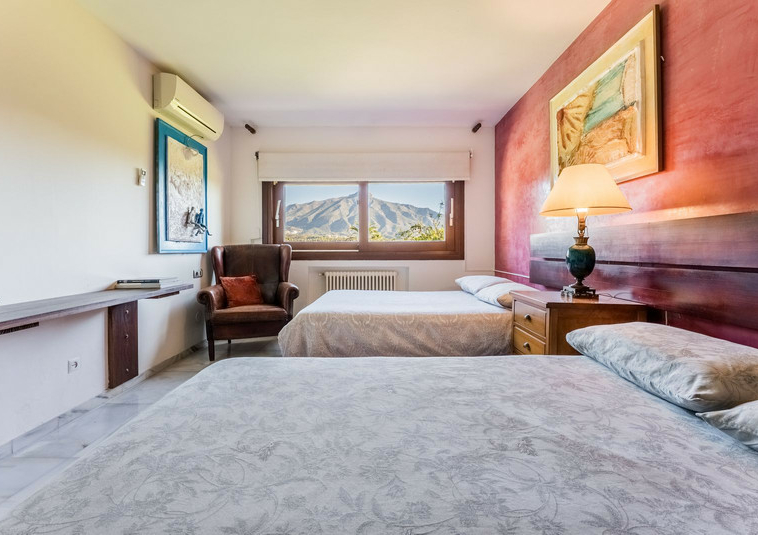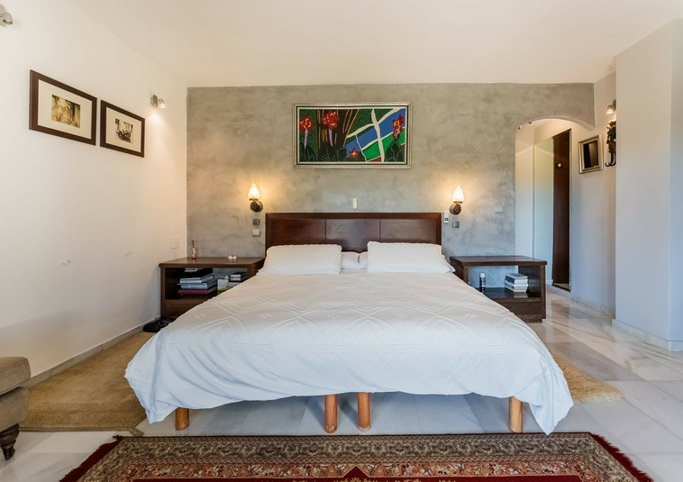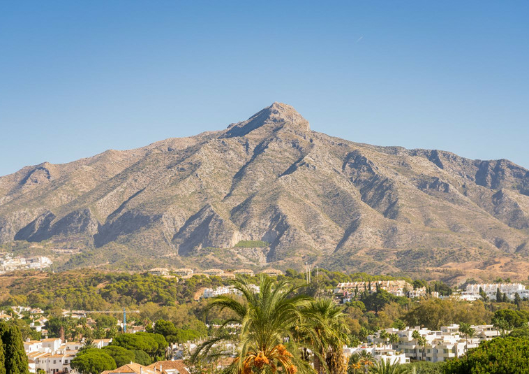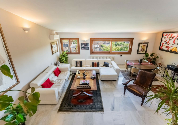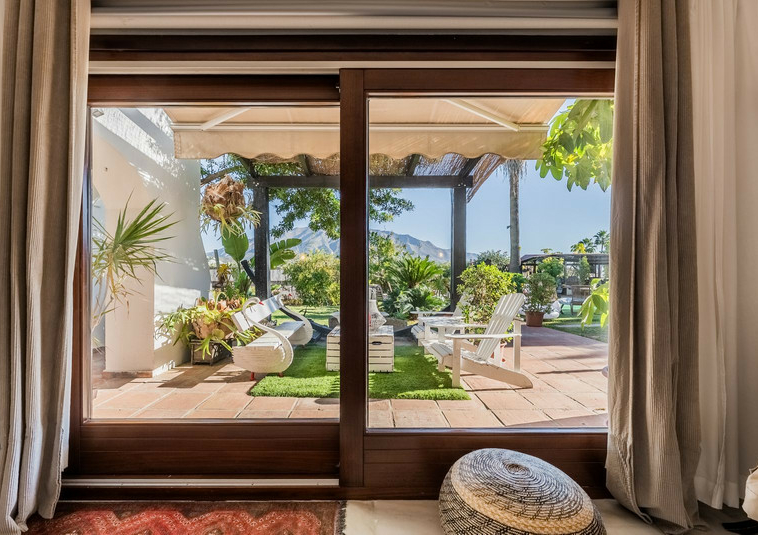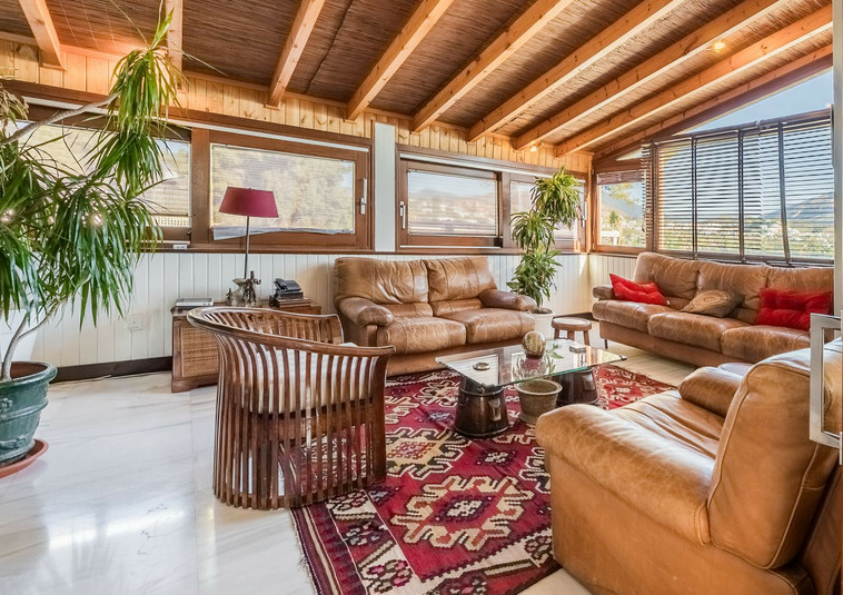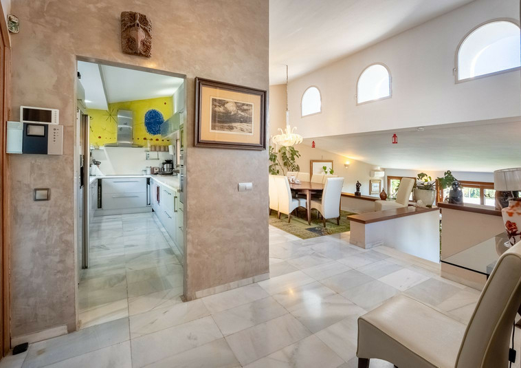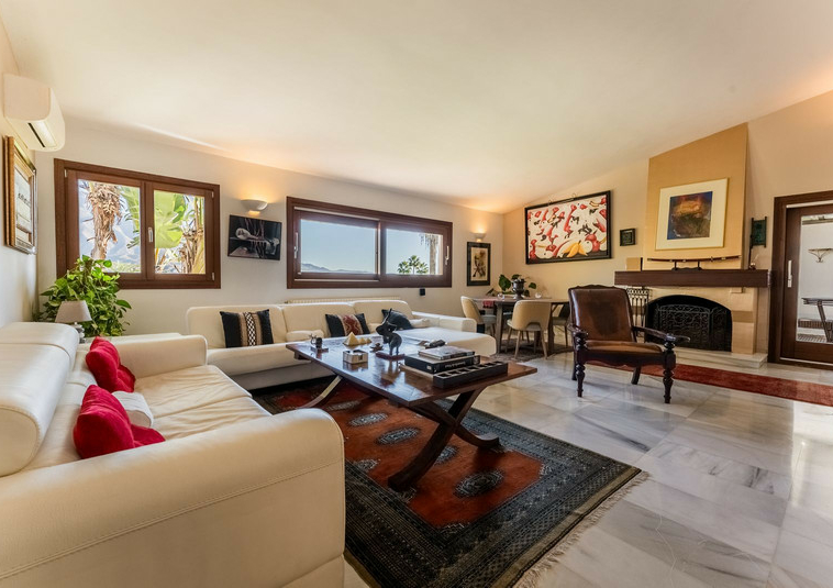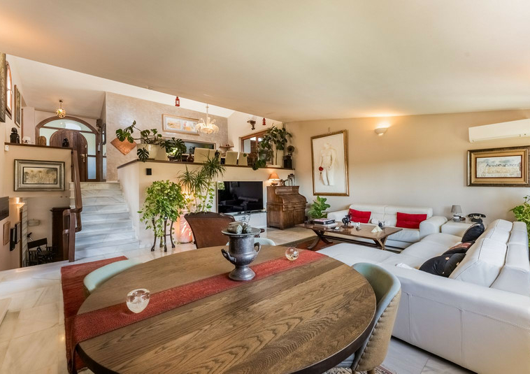 – Segundo nivel: Un gran salón principal que se abre a una amplia terraza cubierta con zona de estar y barbacoa, disfrutando de vistas panorámicas al jardín, piscina, montañas y Marbella paisaje urbano.