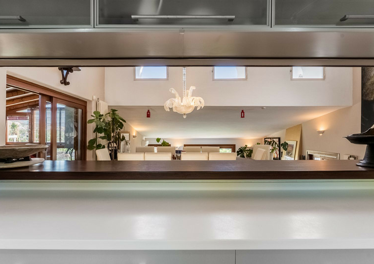 – Planta alta: Una amplia zona de estar de 80 m2 y una oficina de 40 m2 con vistas directas al jardín y a la piscina.