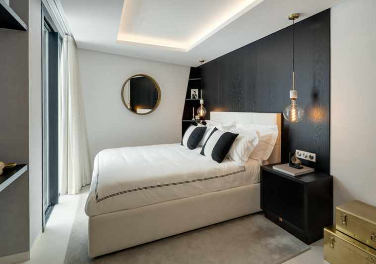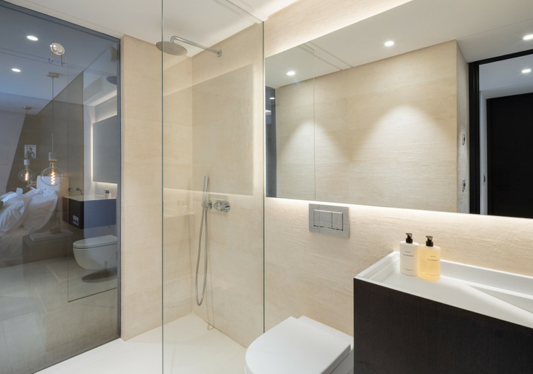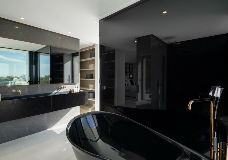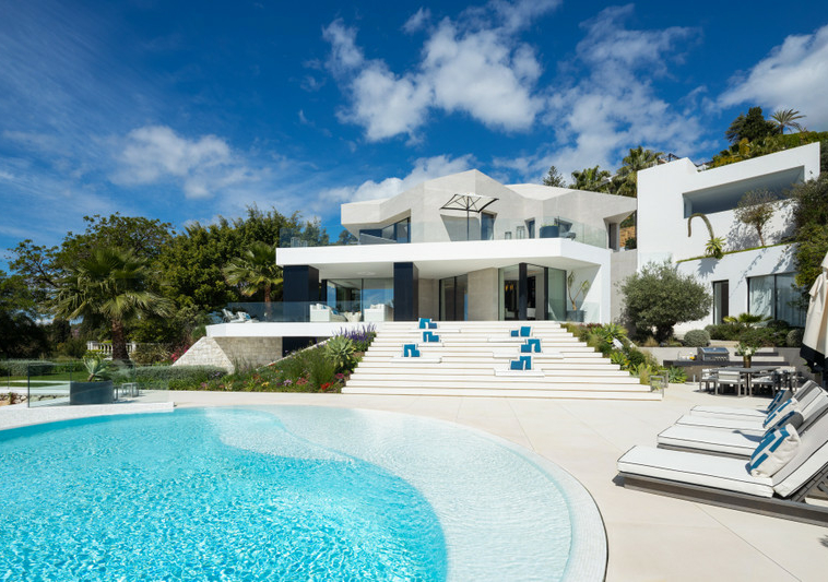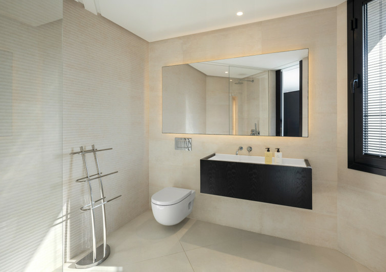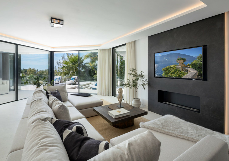 La villa cuenta con cinco amplios dormitorios y ocho baños, seis de ellos en suite. Cada espacio refleja un diseño contemporáneo refinado, con acabados de alta calidad y grandes ventanales que enmarcan vistas despejadas al mar Mediterráneo. La distribución ha sido diseñada para maximizar la luz natural y lograr una transición fluida entre los ambientes de estar, comedor y descanso. Además, dispone de dos aseos de cortesía para mayor comodidad.