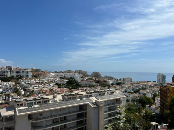 Este ático en Benalmádena está a la venta por 595.000 € y ofrece 84 m² de espacio interior distribuidos en dos dormitorios y dos baños, con acceso directo a un total de 71 m² de terrazas, incluyendo un solárium privado. El apartamento se vende completamente amueblado y disfruta de una orientación sur-oeste, ideal para contemplar las impresionantes vistas al mar Mediterráneo y a las montañas.