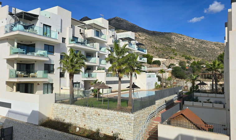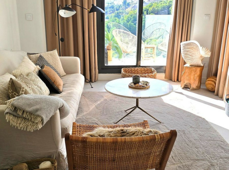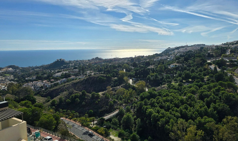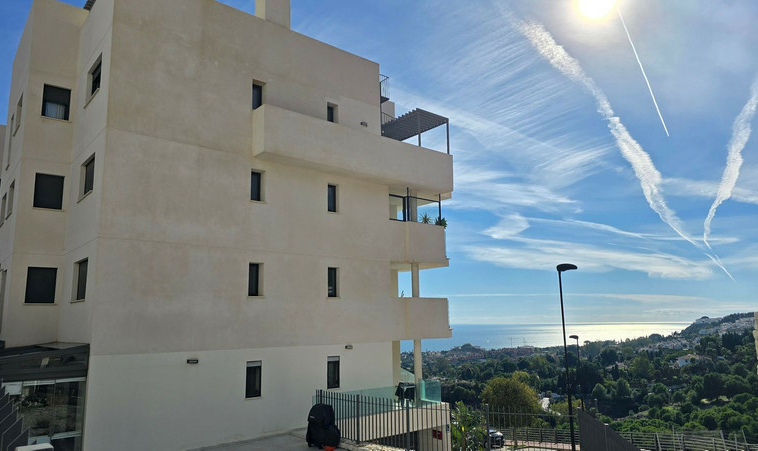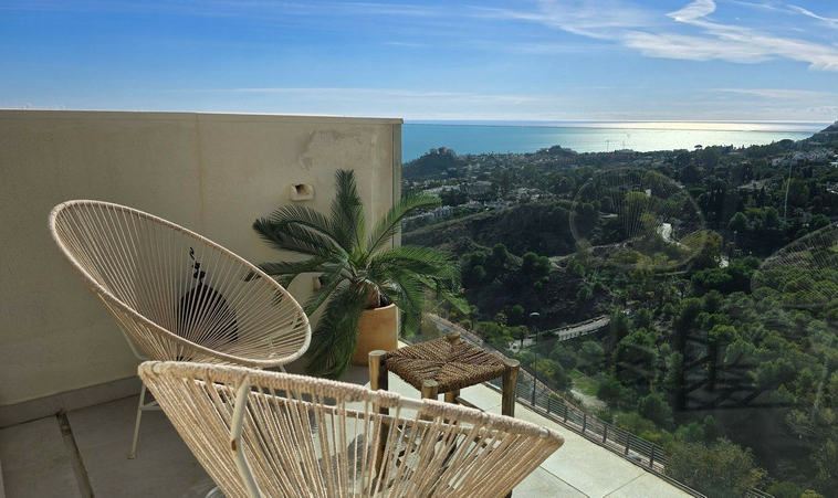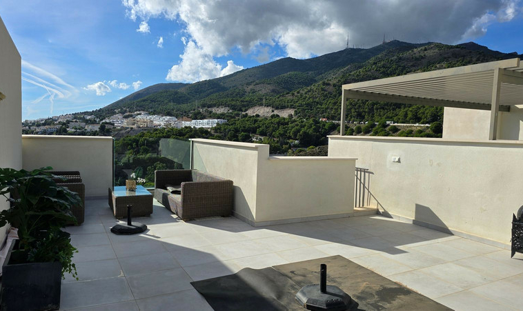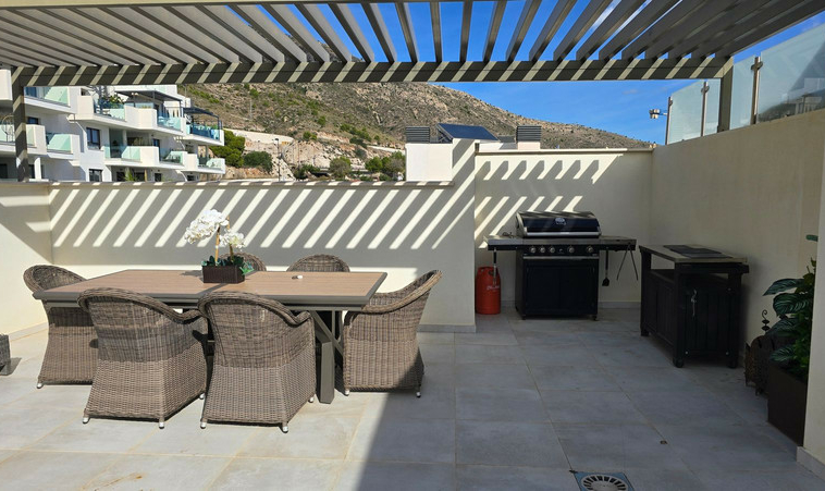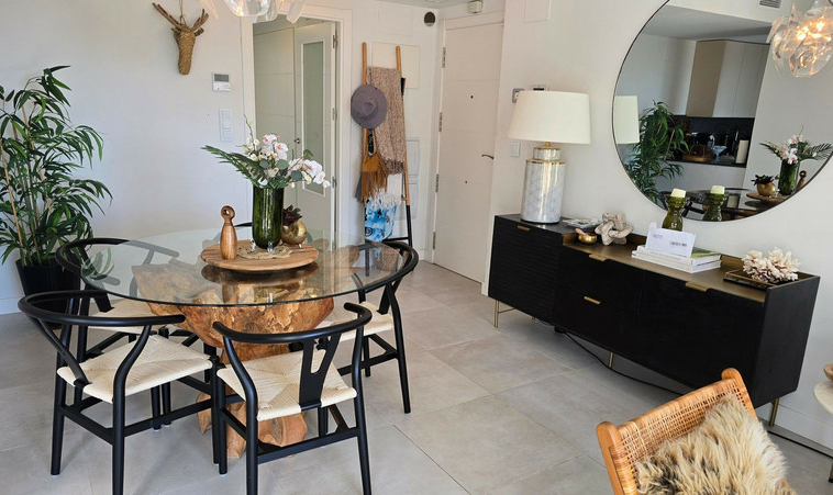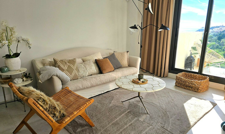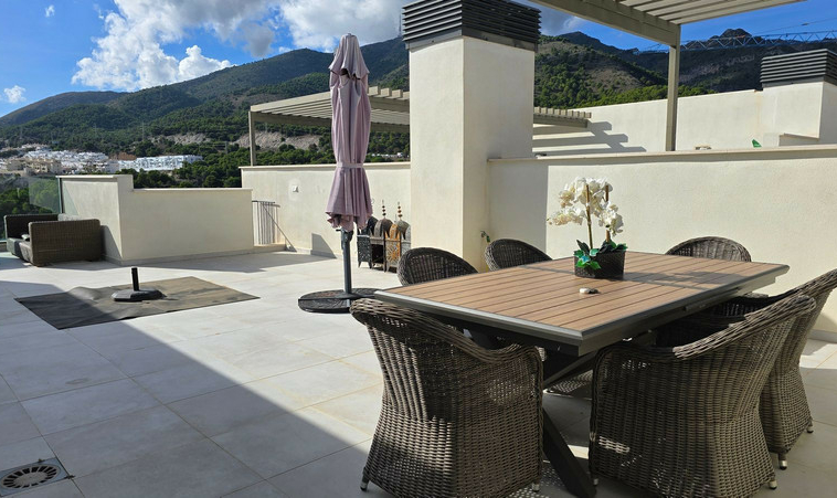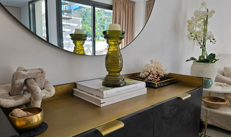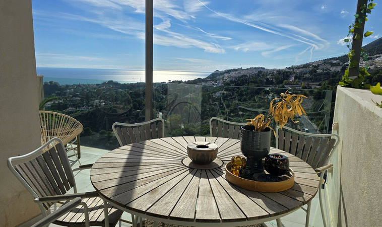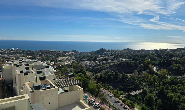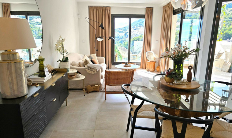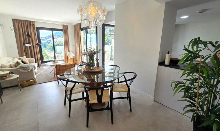 Al entrar en este elegante ático en Horizonte, la primera sensación es la de amplitud, luminosidad y un diseño moderno que invita a relajarse desde el primer momento. La distribución está pensada para ofrecer un flujo natural entre las distintas estancias, creando un ambiente cómodo y práctico para el día a día. El salón se conecta directamente con la amplia terraza a través de grandes puertas correderas, generando una transición suave entre interior y exterior. Desde aquí, las vistas panorámicas al mar y a las montañas acompañan cada momento del día.