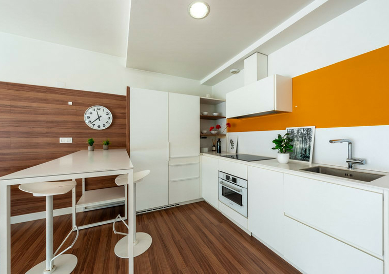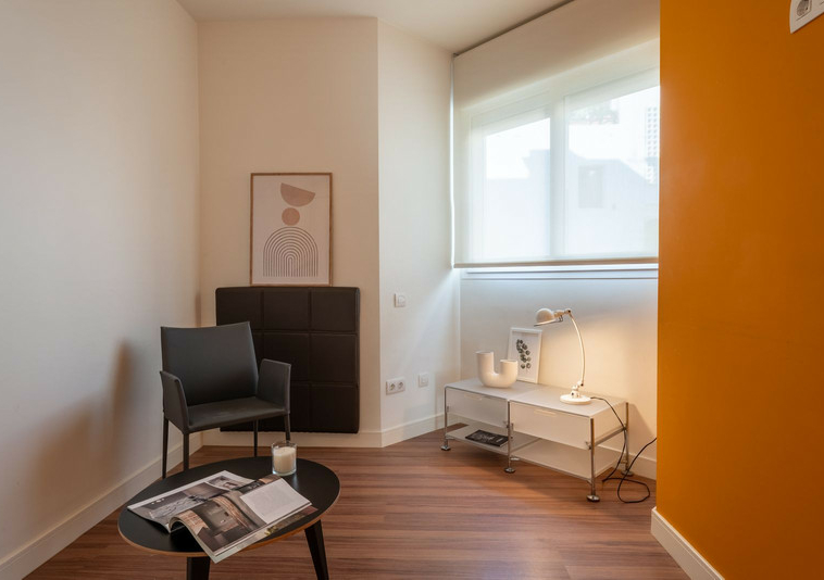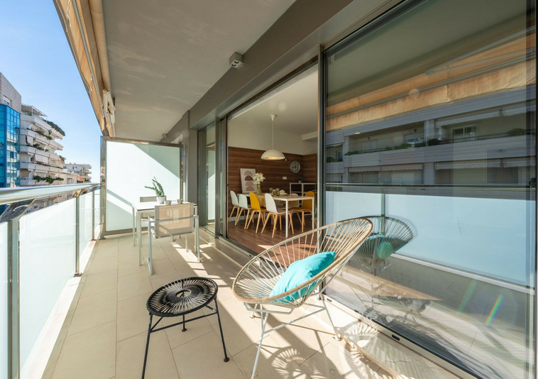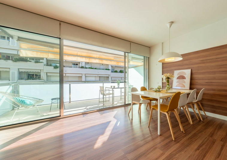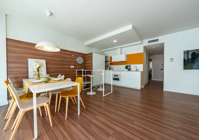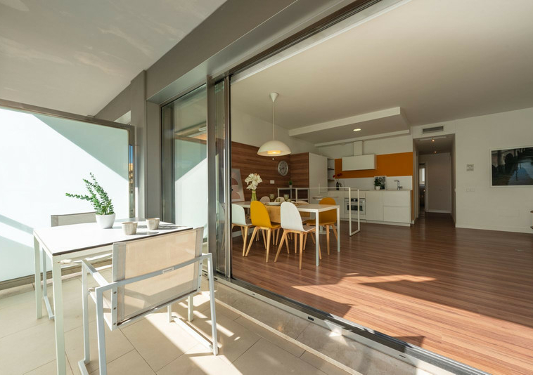 El salón-comedor, amplio y muy luminoso, integra una moderna cocina abierta totalmente equipada y amueblada, creando un ambiente acogedor y práctico para el día a día. Desde esta estancia se accede a la agradable terraza cubierta de 11 m² con vistas urbanas, perfecta para disfrutar del clima mediterráneo durante todo el año.