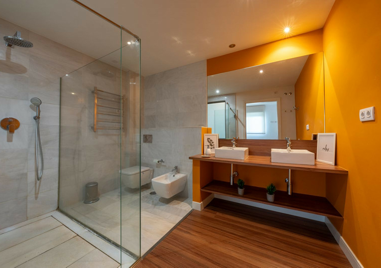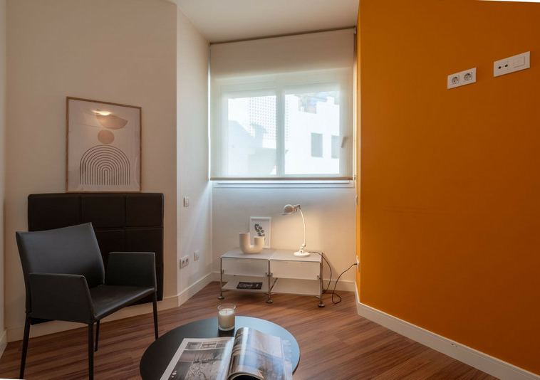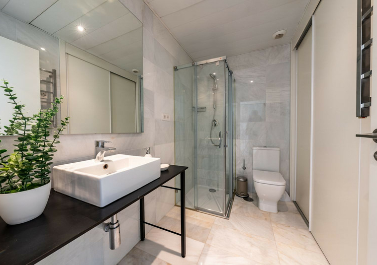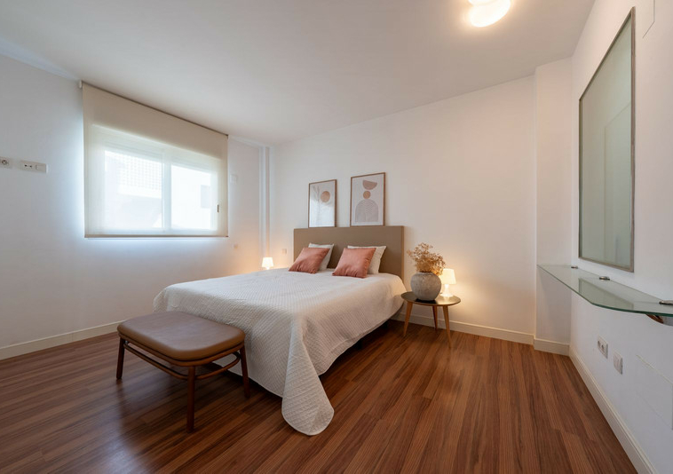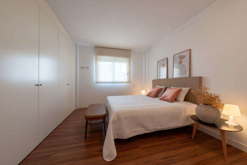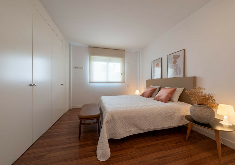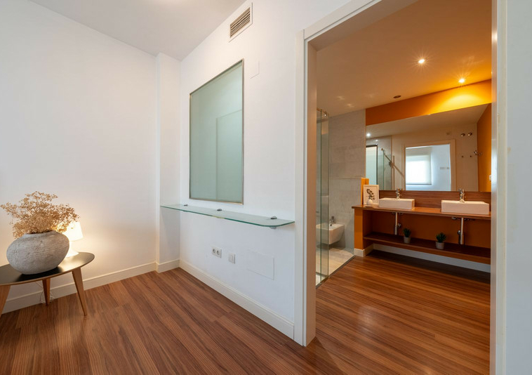 El inmueble destaca por su excelente distribución. El hall de entrada da acceso a un dormitorio individual y a un dormitorio principal de gran tamaño con baño en suite. A continuación, encontramos un segundo baño completo, que incorpora un amplio armario donde se ubica la zona de lavado, aportando funcionalidad y orden al espacio.