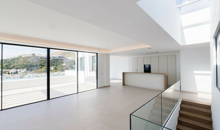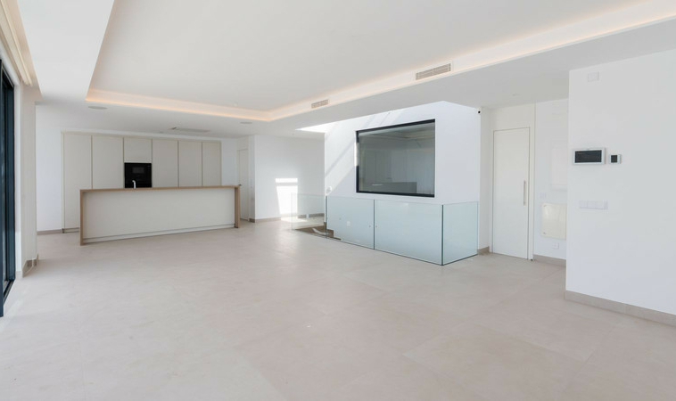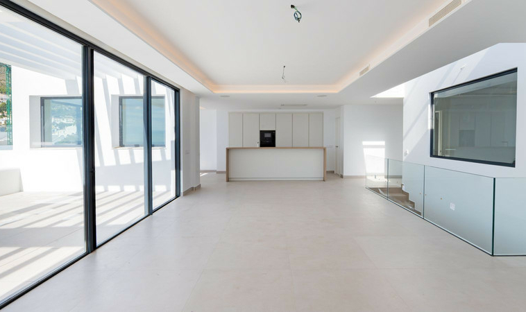 El espacio principal combina cocina de diseño, comedor y sala de estar en un concepto abierto que fluye hacia una terraza orientada al sur-oeste. Aquí podrás disfrutar de la vida al aire libre en una espectacular terraza, de grandes dimensiones y una piscina privada.