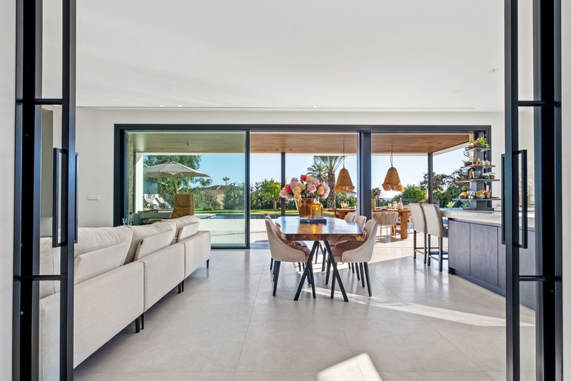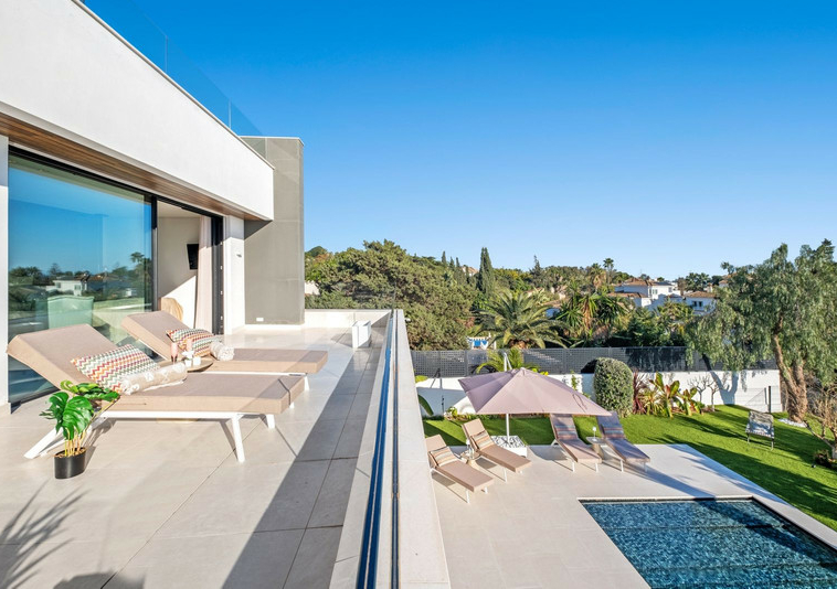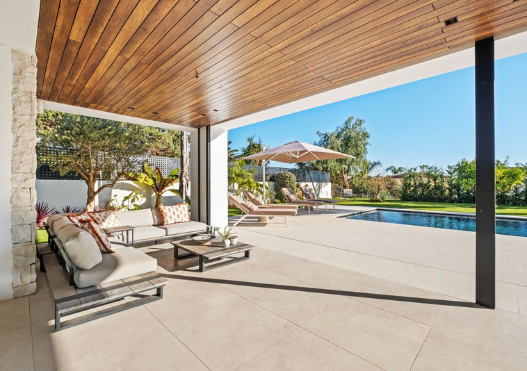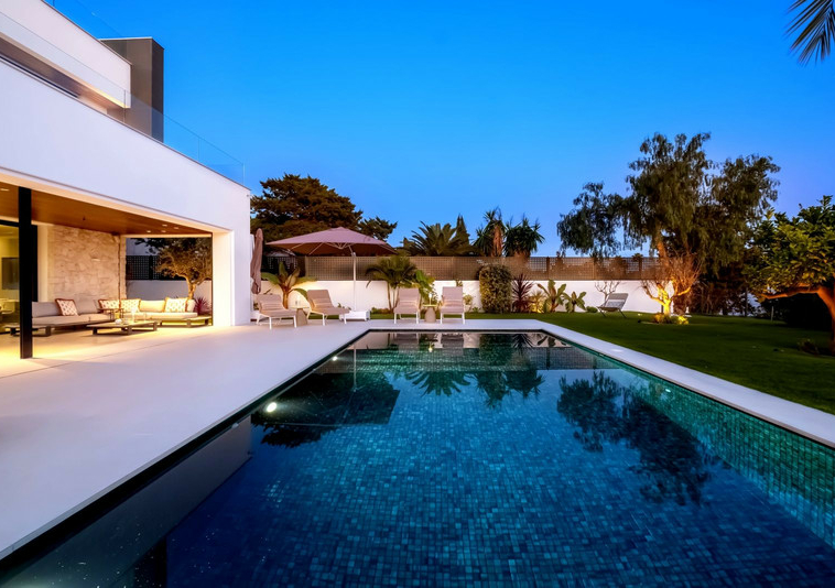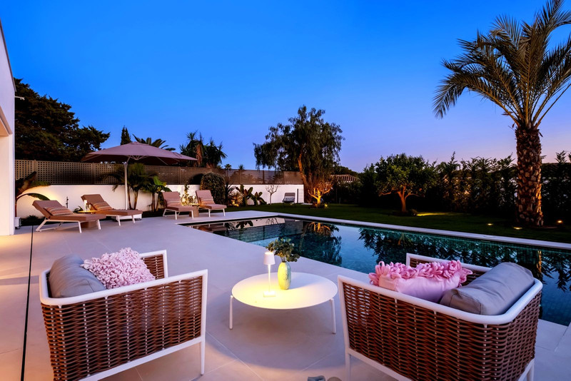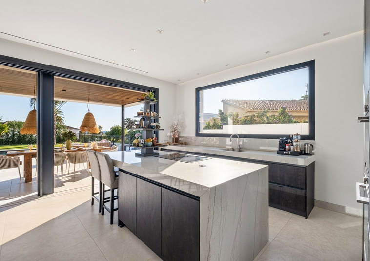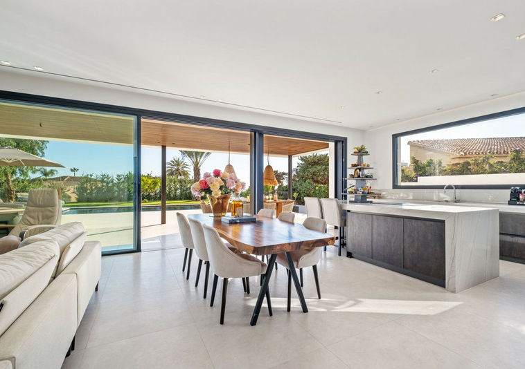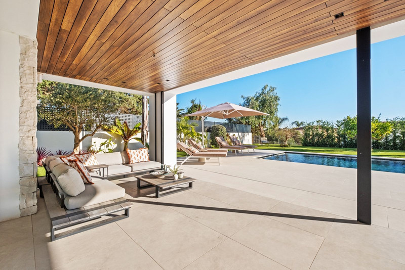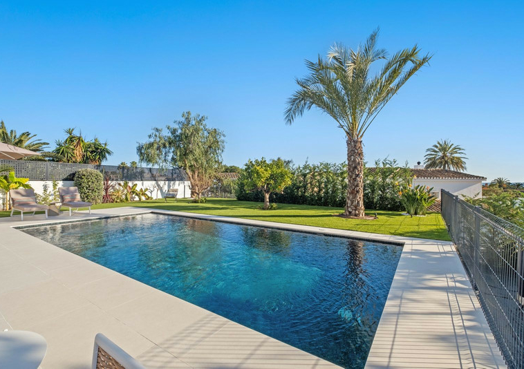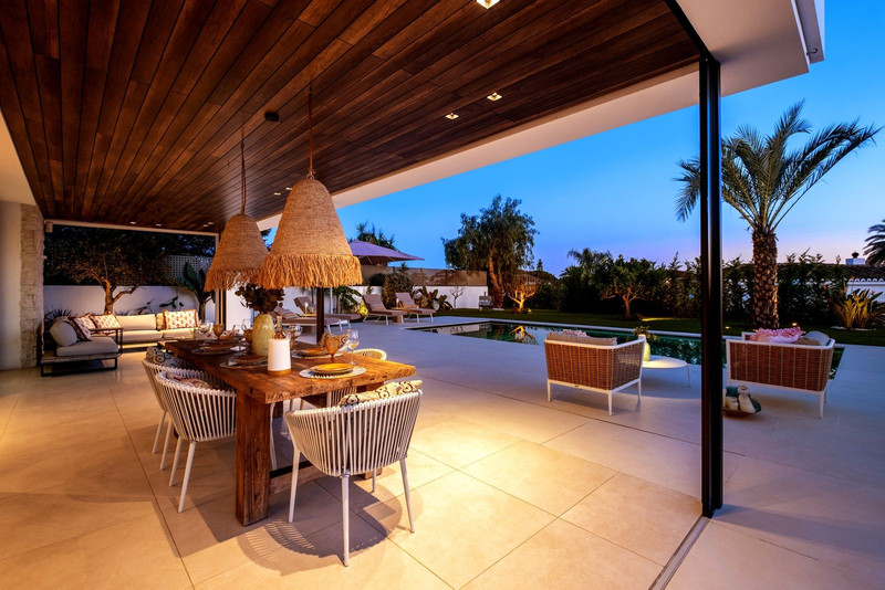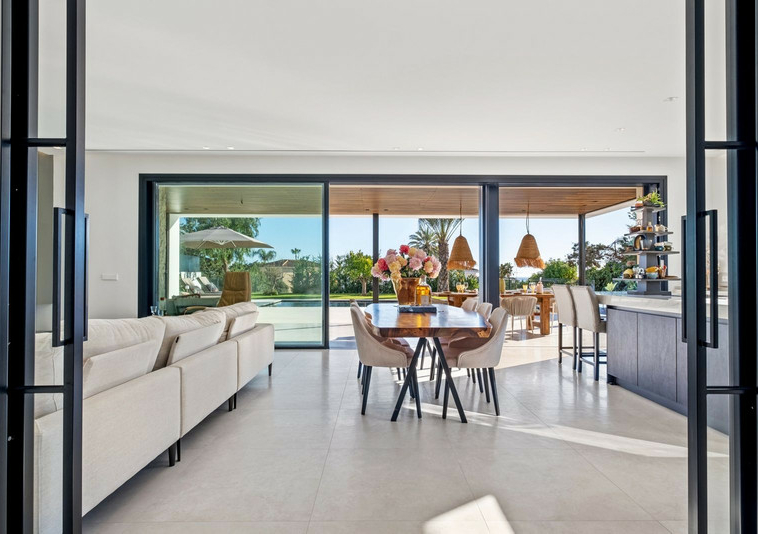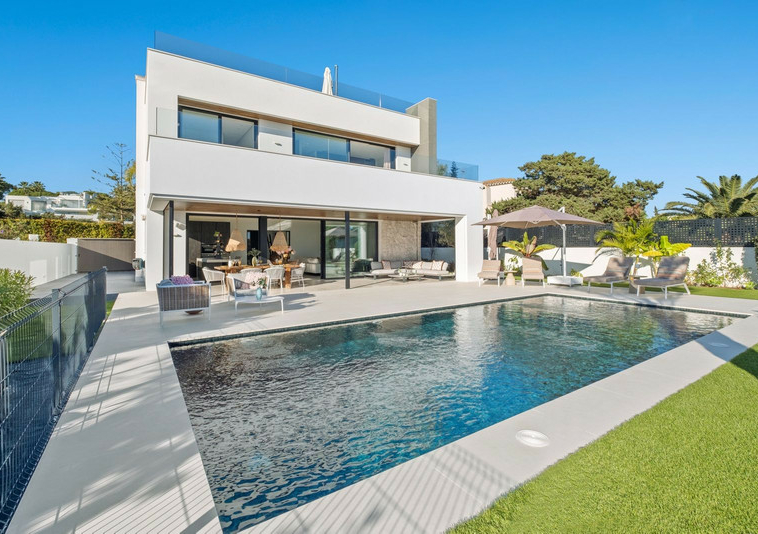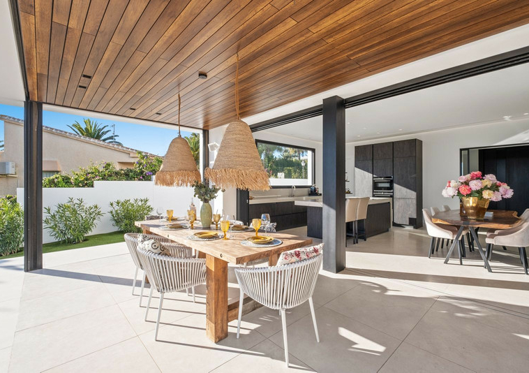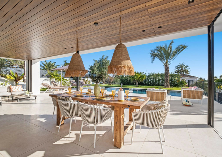 Con una distribución que fomenta una transición fluida entre las áreas interiores y exteriores, la villa ofrece amplias terrazas, perfectas para el entretenimiento o el relax. La piscina, con su color inspirado en Bali, se convierte en la pieza central visual del jardín, diseñado para un mantenimiento mínimo (solo 250 €/mes por el mantenimiento semanal del jardín y la piscina). Además, la propiedad cuenta con toldos eléctricos y pantallas automáticas contra mosquitos en toda la terraza cubierta, asegurando privacidad y confort durante todo el año.