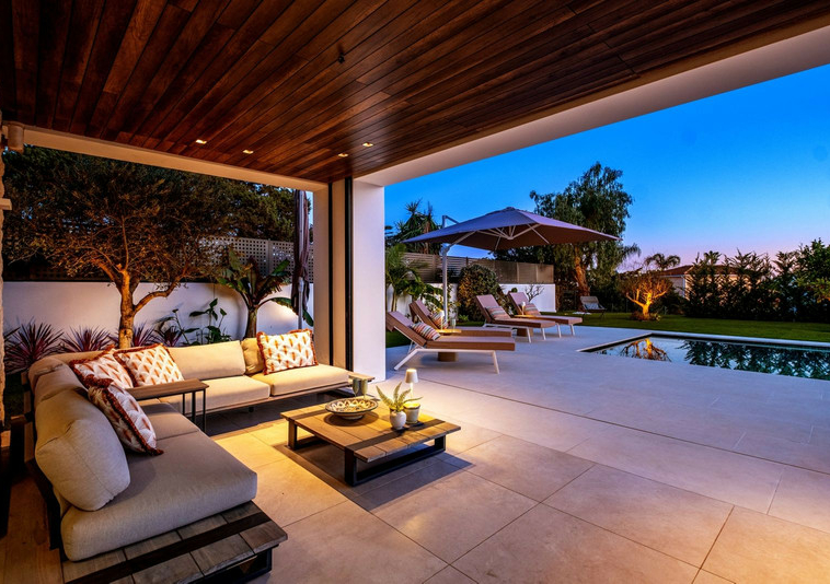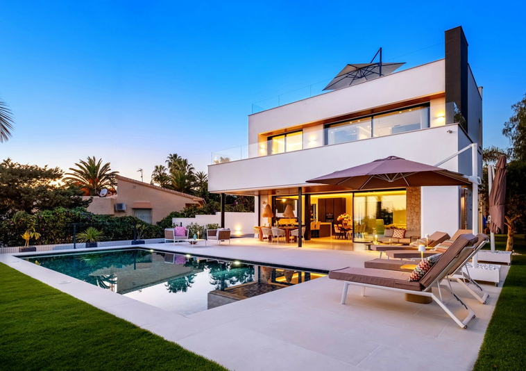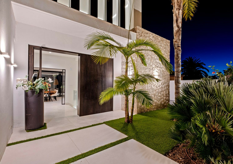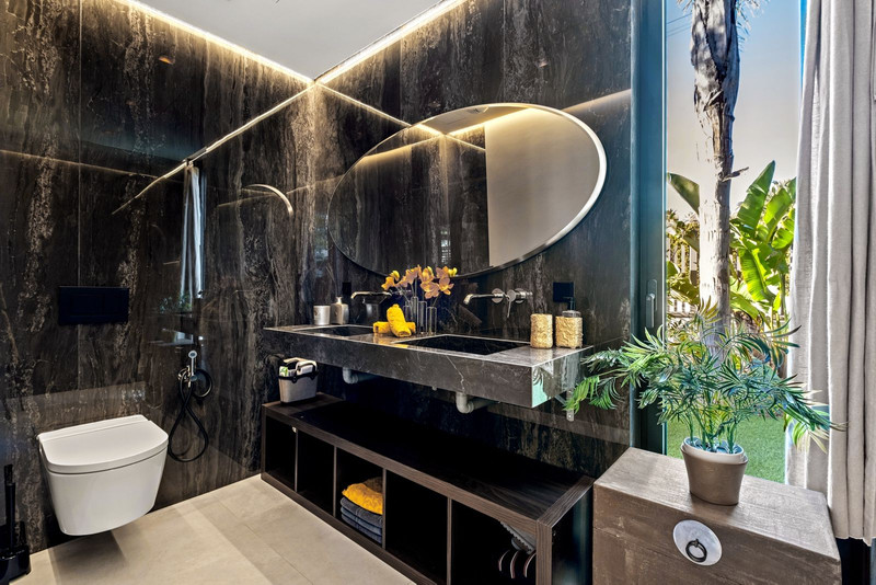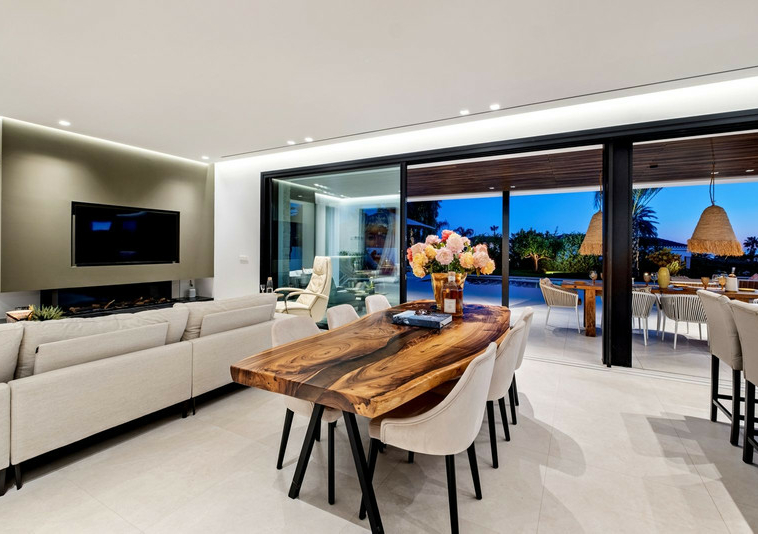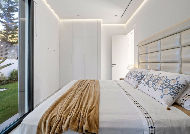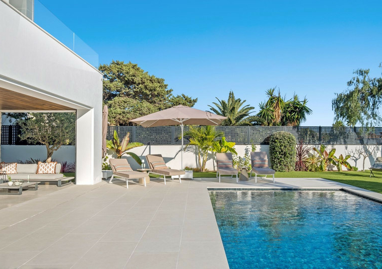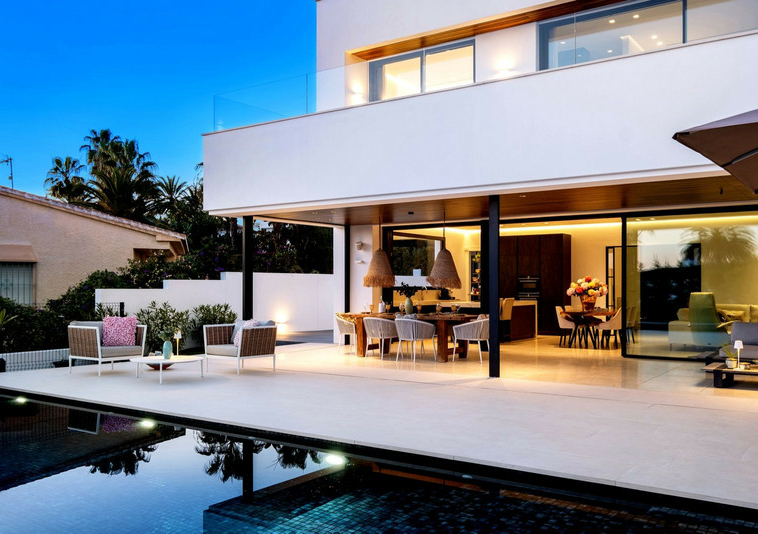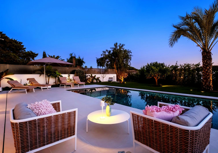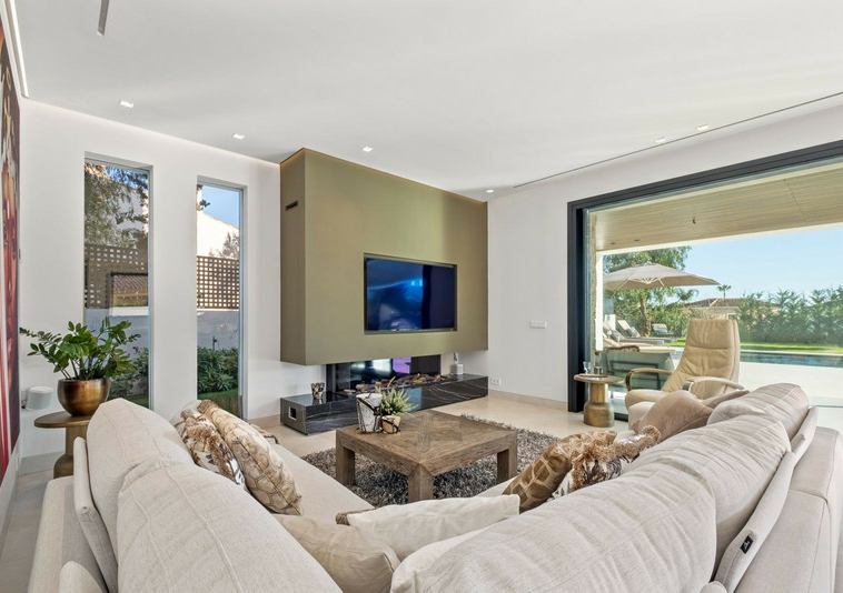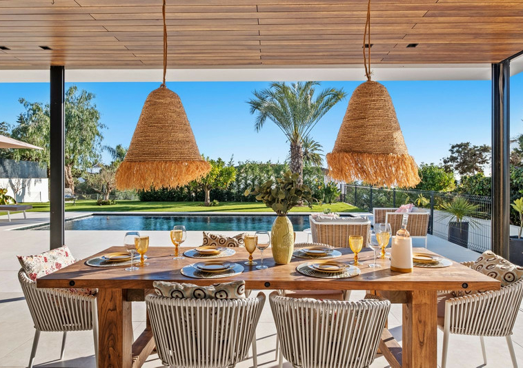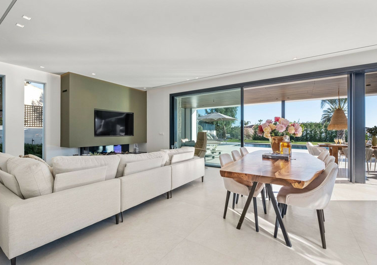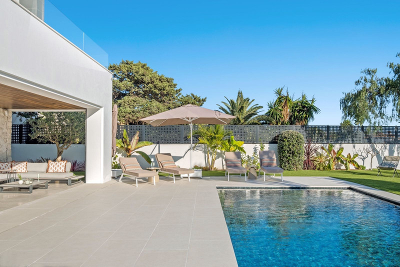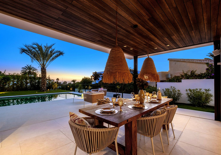 Con una distribución que fomenta una transición fluida entre las áreas interiores y exteriores, la villa ofrece amplias terrazas, perfectas para el entretenimiento o el relax. La piscina, con su color inspirado en Bali, se convierte en la pieza central visual del jardín, diseñado para un mantenimiento mínimo (solo 250 €/mes por el mantenimiento semanal del jardín y la piscina). Además, la propiedad cuenta con toldos eléctricos y pantallas automáticas contra mosquitos en toda la terraza cubierta, asegurando privacidad y confort durante todo el año.