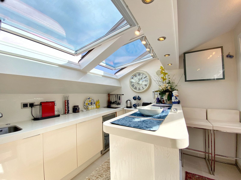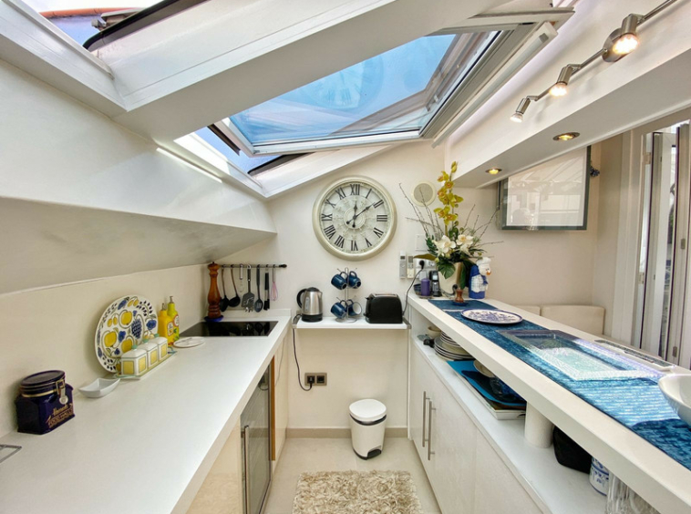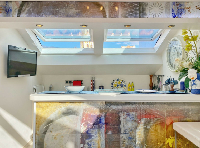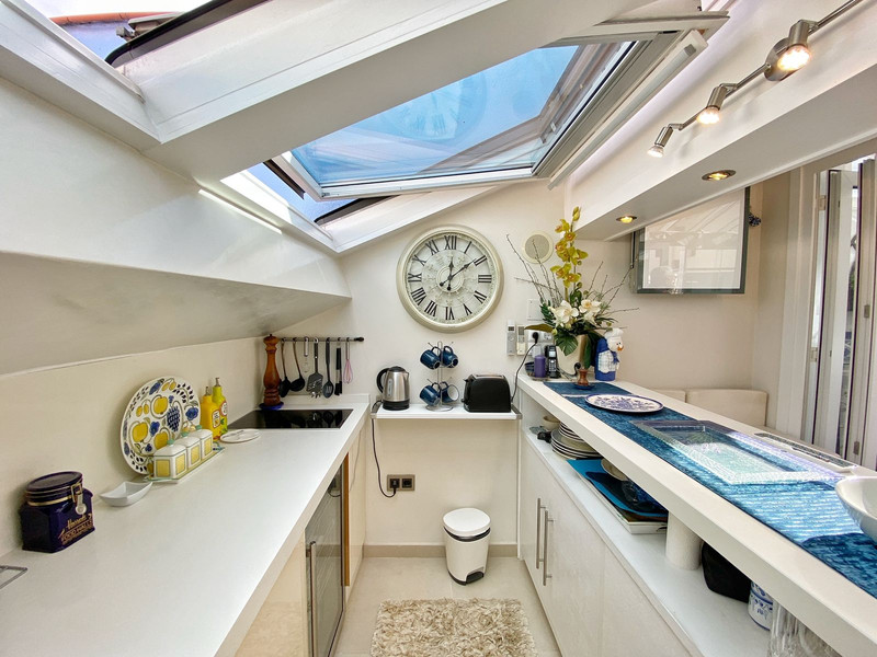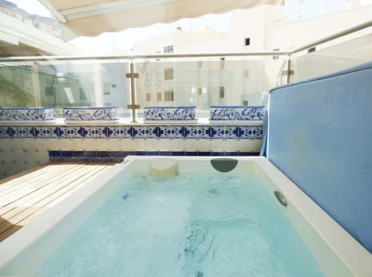 En la planta superior hay también una segunda pequeña cocina,ubicada junto a una terraza exterior cubierta de 35 m2, muy soleada, con jacuzzi y vistas del casco antiguo.