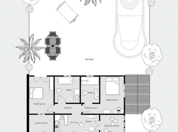 La gran piscina se encuentra al costado de la propiedad rodeada por un patio con una pérgola en la parte trasera del área de la piscina, lo que sería un hermoso lugar con sombra.