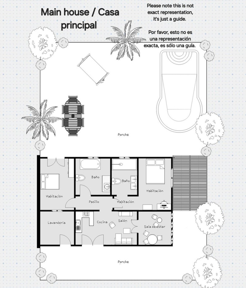 El dormitorio principal también se encuentra al frente de la propiedad con baño privado. El dormitorio 2 tiene el lujo adicional de ventanas francesas que se abren directamente al área de la piscina. El baño de visitas se encuentra al lado del dormitorio 2. También se accede a un lavadero a través del paito de entrada.