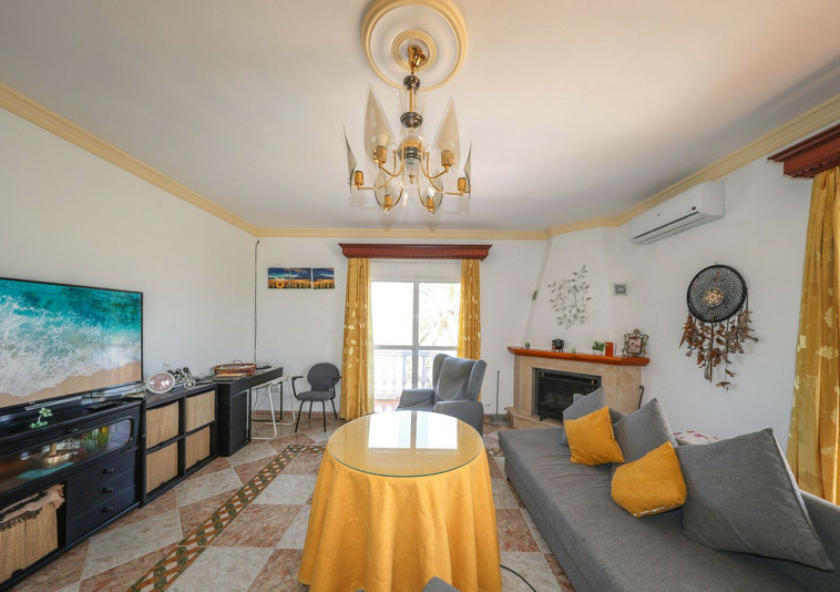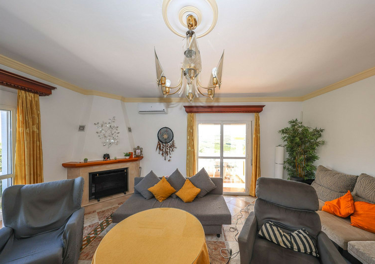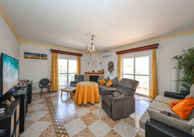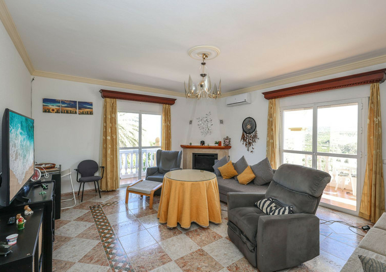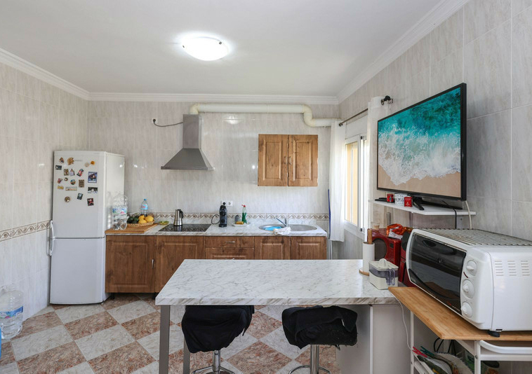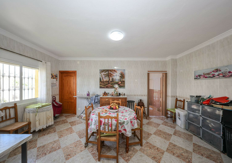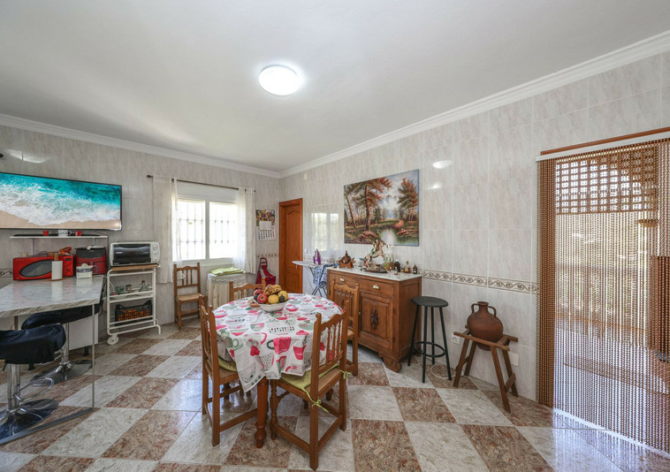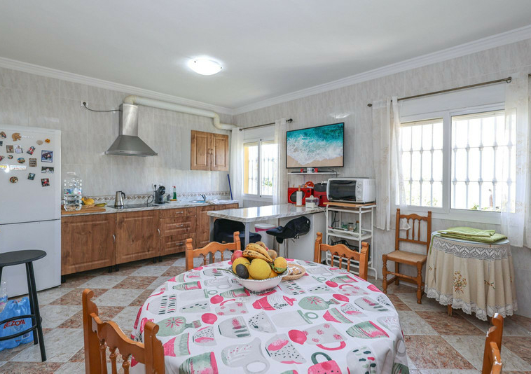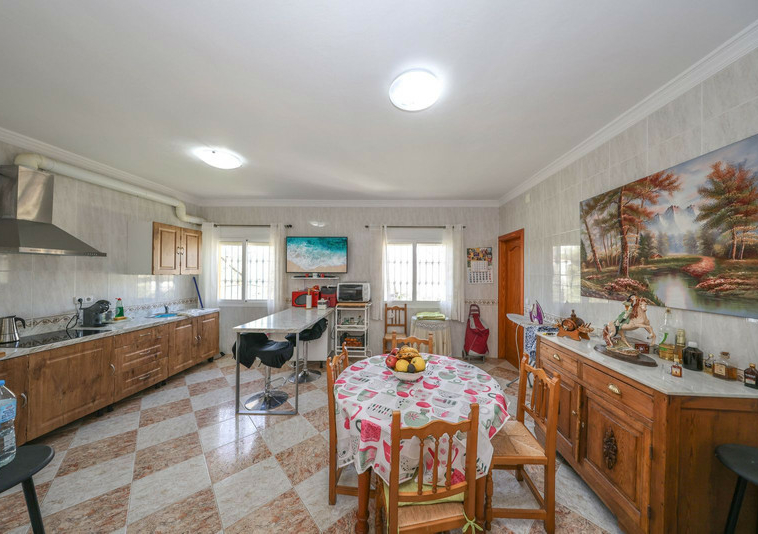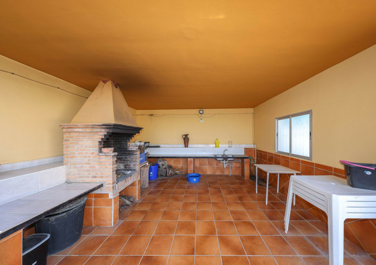 La amplia cocina familiar cuenta con muebles empotrados, zona de comedor y una práctica despensa. Junto a la cocina, el espacioso salón incluye una chimenea y dos puertas correderas que dan a una terraza elevada, ideal para disfrutar de las vistas panorámicas al campo.