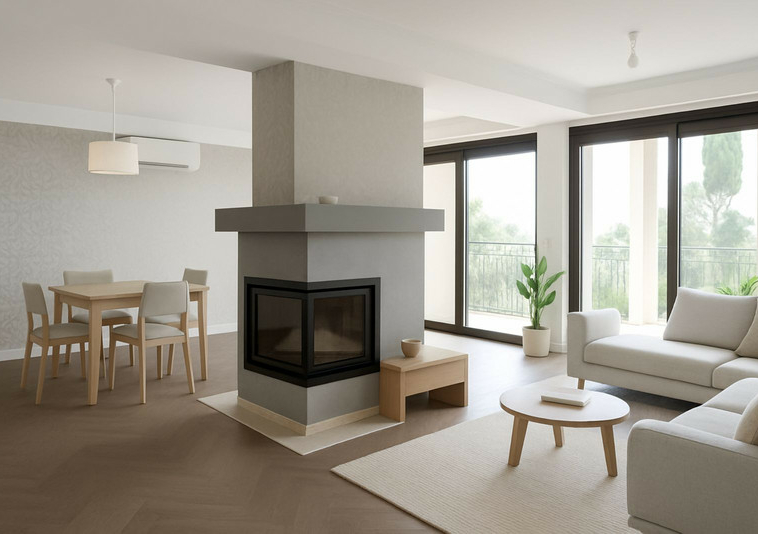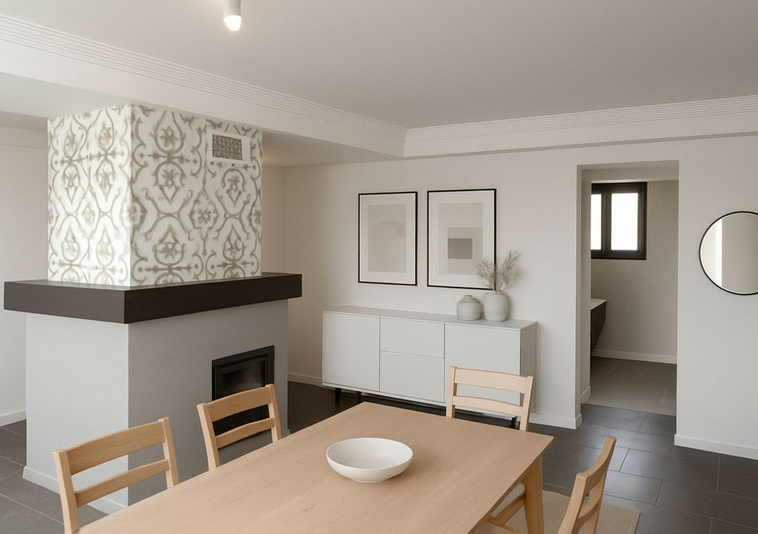 * Salón-comedor amplio y diáfano con chimenea de diseño
