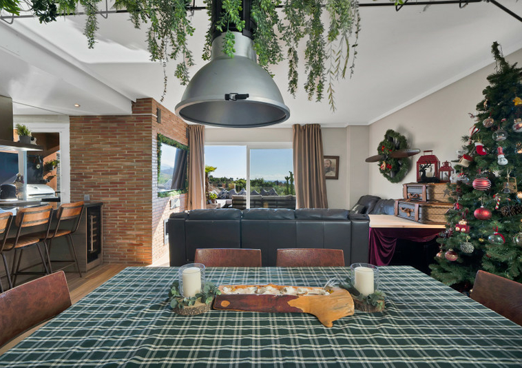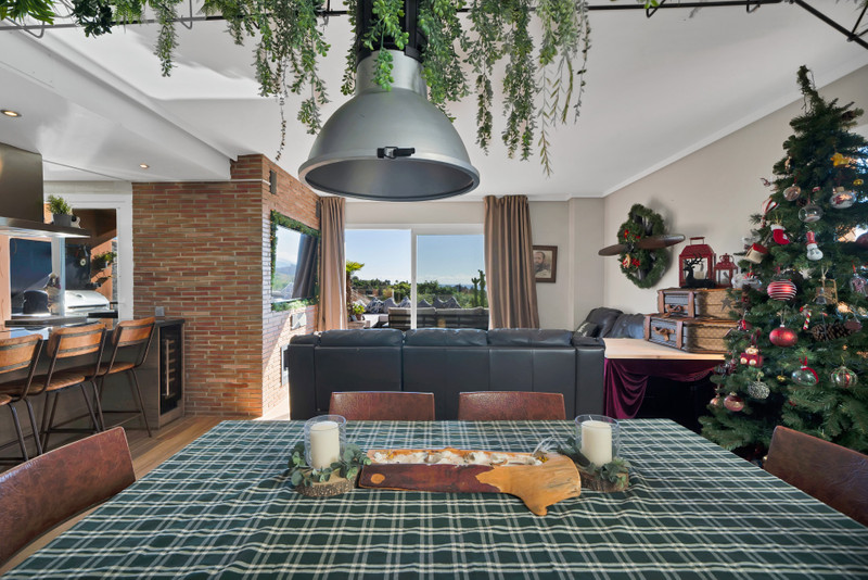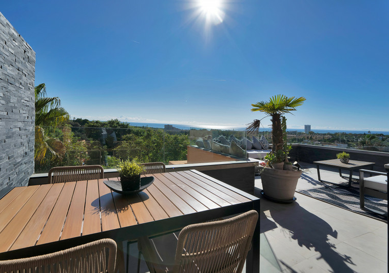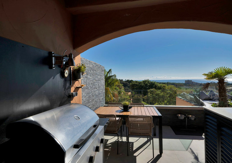 Una gran terraza dividida en tres zonas, una parte principal con sofás, otra en la zona de la cocina con una bbq y mesa, y la parte que da al dormitorio de la planta baja.