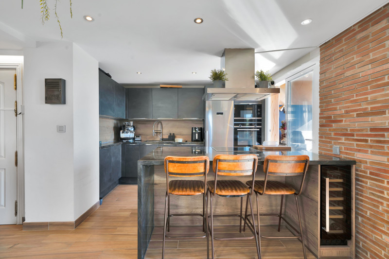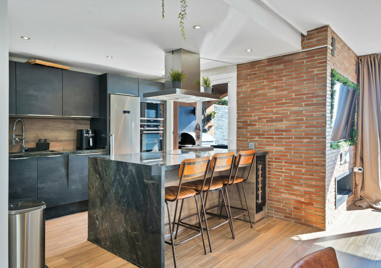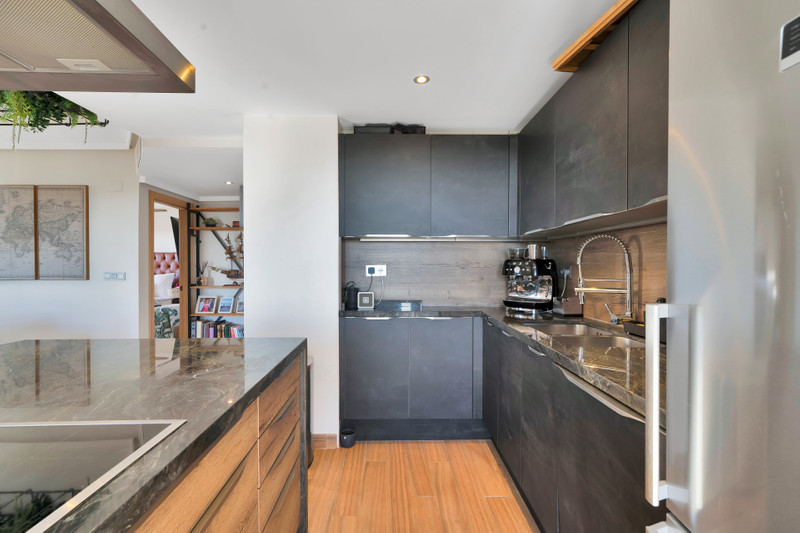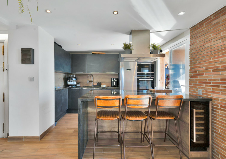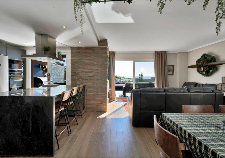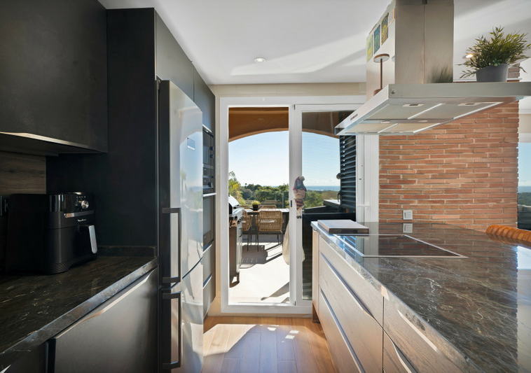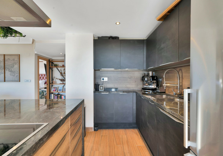 La cocina, de espectacular diseño, ha sido completamente renovada y abierta al salón comedor, creando un espacio único.