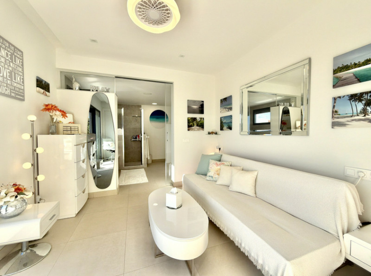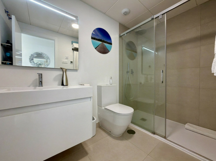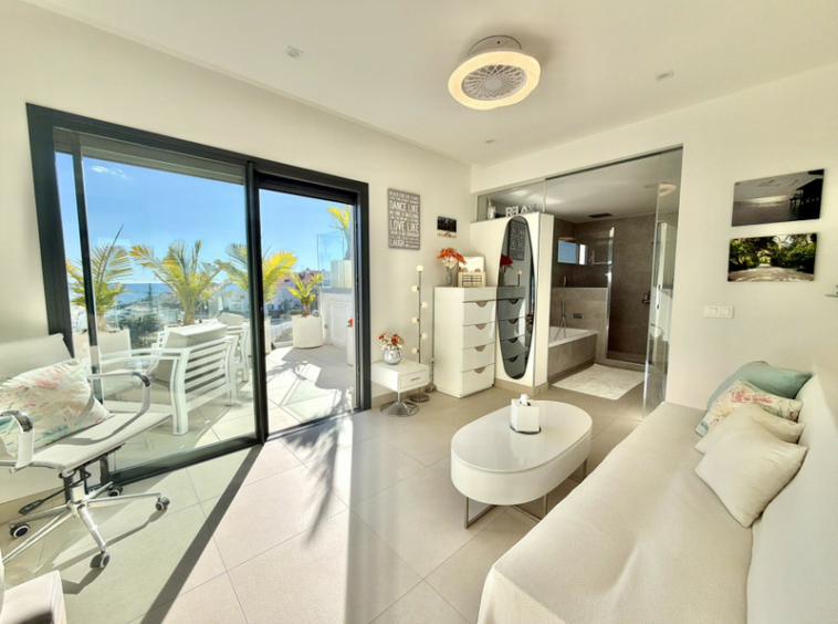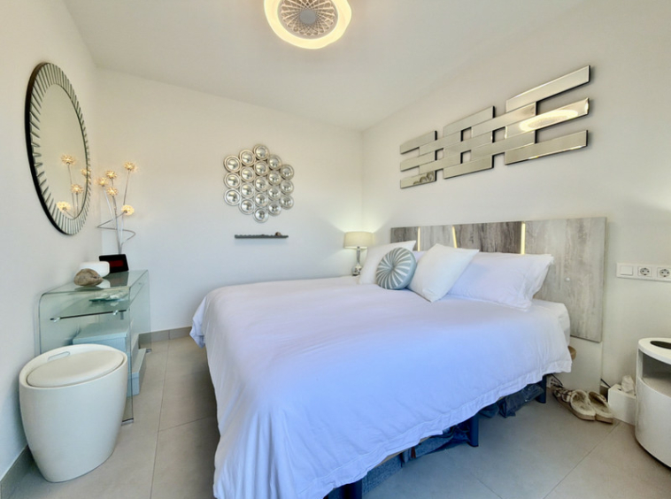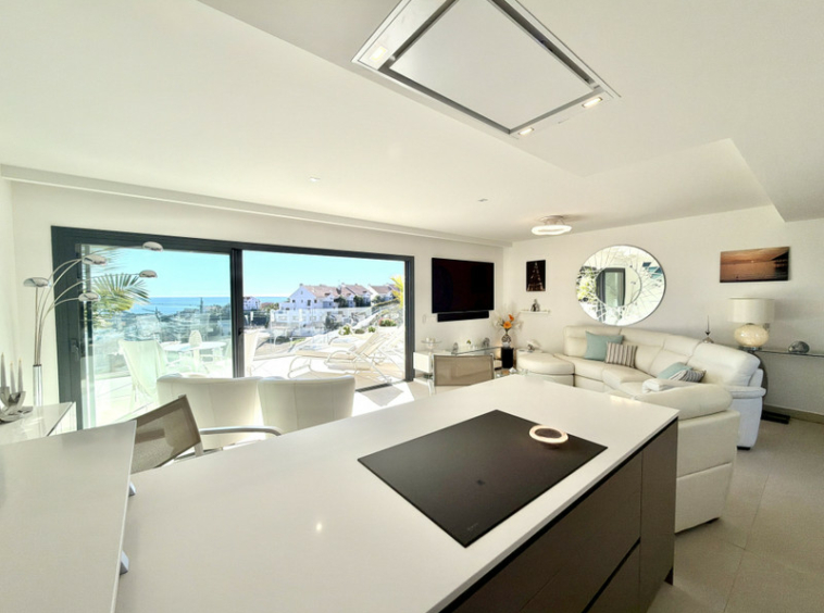 En el interior, la propiedad destaca por sus espacios luminosos, modernos y con un diseño de planta abierta. Dispone de dos dormitorios y dos baños, incluido un cómodo dormitorio principal con baño en suite. El dormitorio de invitados cuenta con su propia terraza privada orientada hacia las montañas de Mijas.