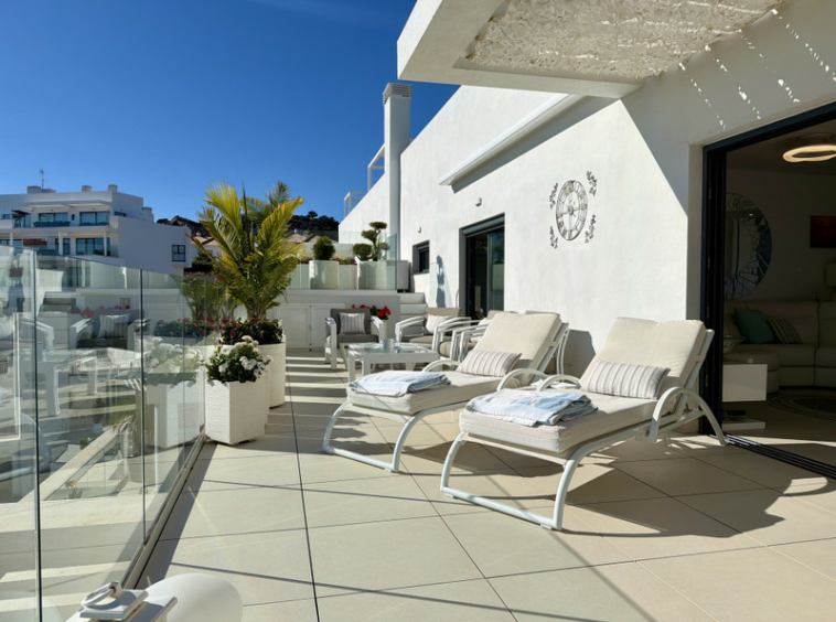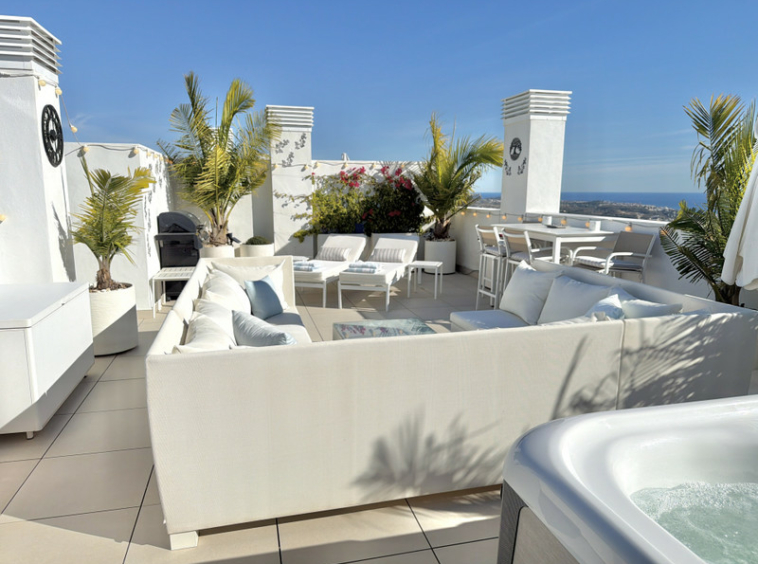 Este excepcional ático dúplex se encuentra en lo más alto del valle de La Cala, ofreciendo una combinación única de privacidad, amplitud y vistas espectaculares en todas las direcciones. Situado en una posición elevada, la vivienda cuenta con varias terrazas amplias, incluida una gran terraza principal conectada directamente con el salón y el dormitorio principal, además de una piscina de inmersión ideal para relajarse.