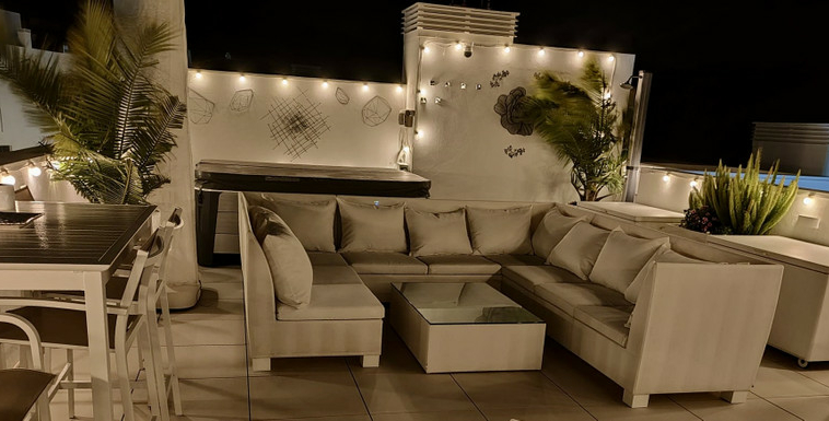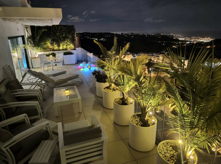 La terraza solárium ofrece auténticas vistas panorámicas de 360 grados, con una perspectiva incomparable sobre el campo de golf Calanova, el mar Mediterráneo y las montañas que rodean la zona.