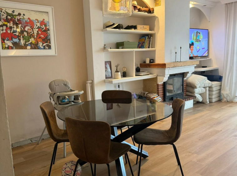 Planta principal: Luminosa, salon comedor muy amplio, con chimenea, con salida a una magnífica terraza-porche y al jardin comunitario con la piscina, ideal para tener controlados a los pequeños de la casa.