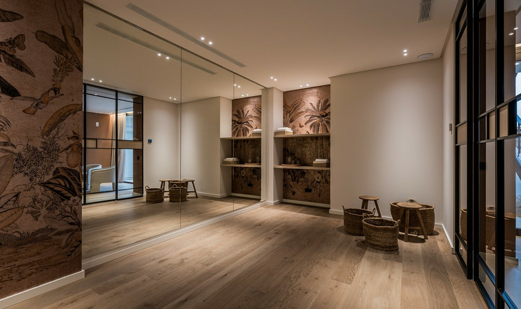 La azotea es el sueño de cualquier artista. Aquí encontrará la cocina exterior, las zonas de estar y comedor, el cine al aire libre y el jacuzzi de la villa, todo ello con impresionantes vistas al campo de golf y al valle. En el sótano se encuentra el gimnasio, revestido con paredes y techo de madera oscura, así como la oficina en casa.