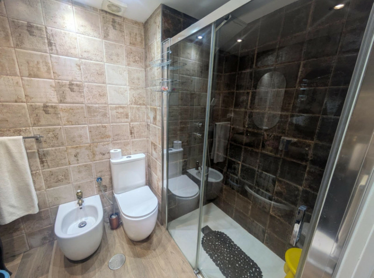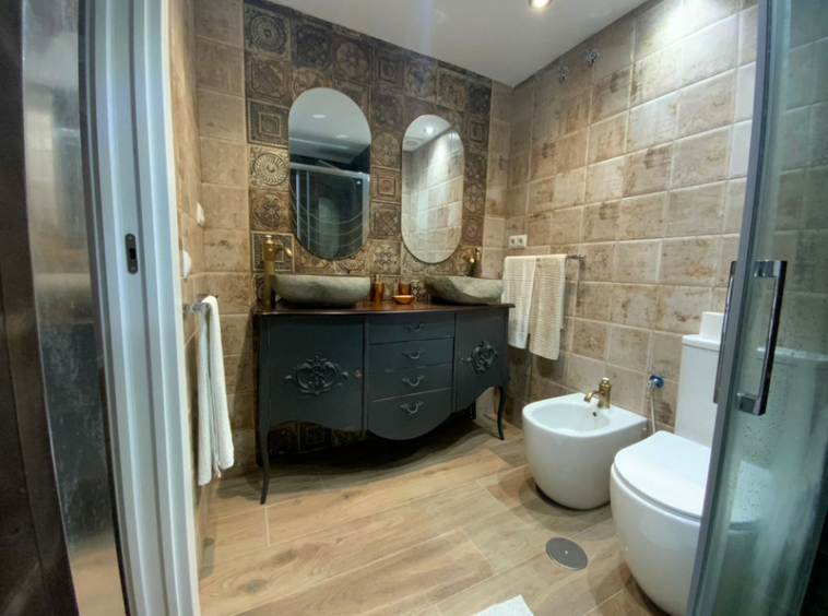 Dos baños: El incluido en el dormitorio principal cuanta con un plato de ducha de pizarra, columna de hidromasaje con agua de lluvia y mampara de cristal. Lavabos de piedra natural.