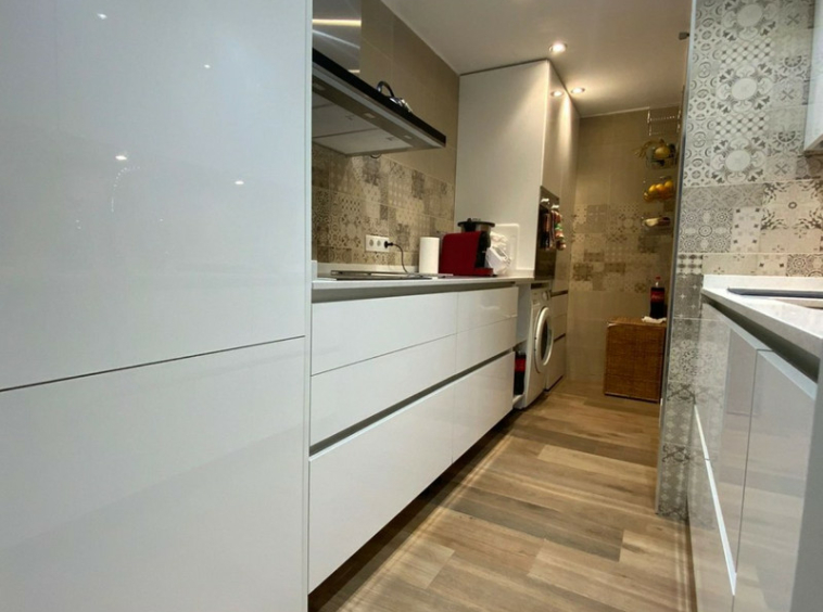 Amplia cocina independiente completamente amueblada con gran capacidad de almacenaje y electrométricos panelados. Cuenta con lavadora, lavavajillas, horno, microondas, placa de inducción, campana extractora, grifería ducha bimando, etc. Encimera de silestone.