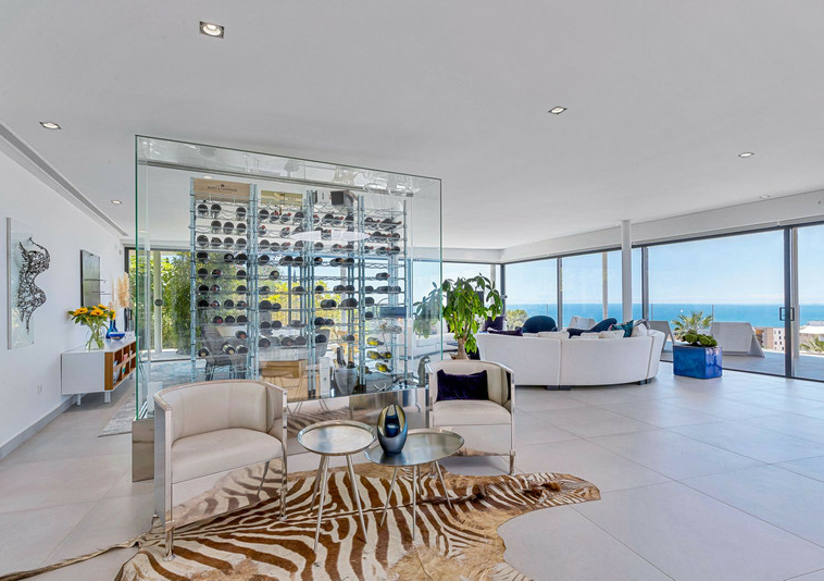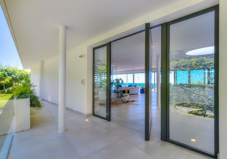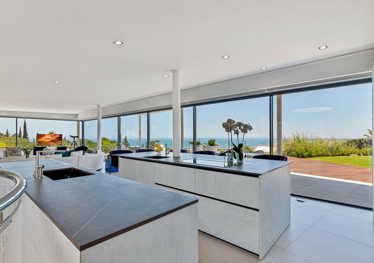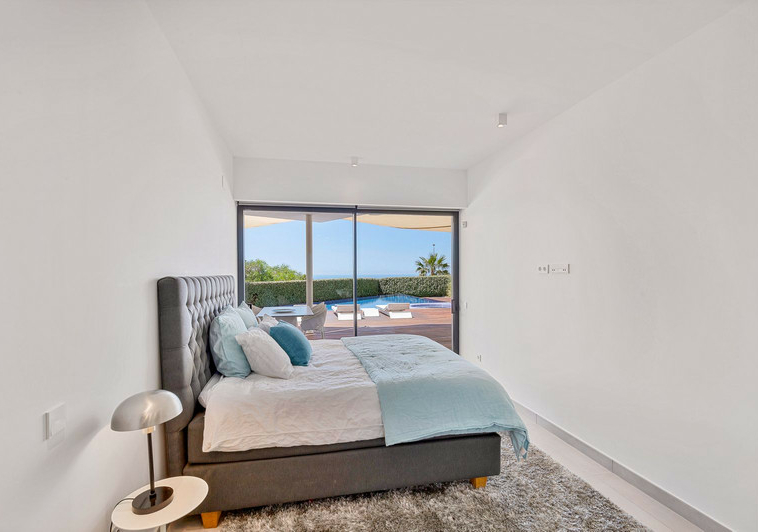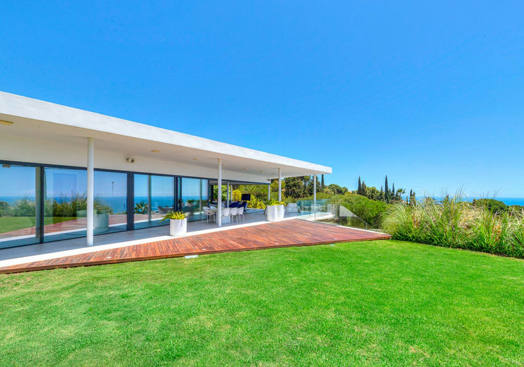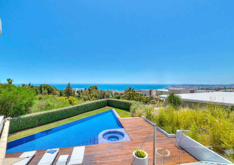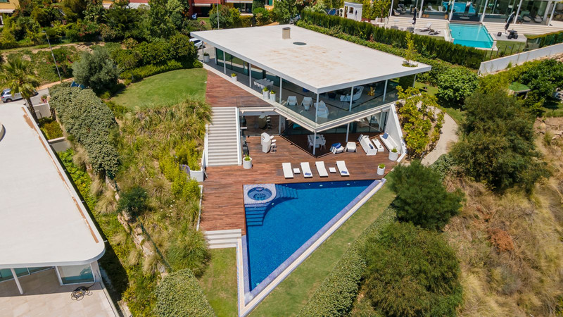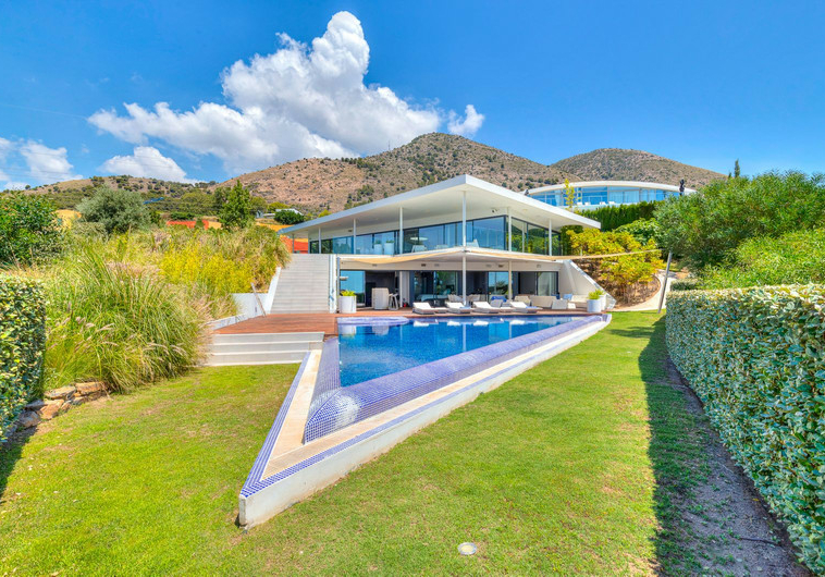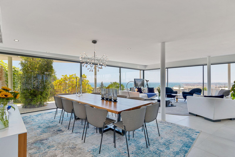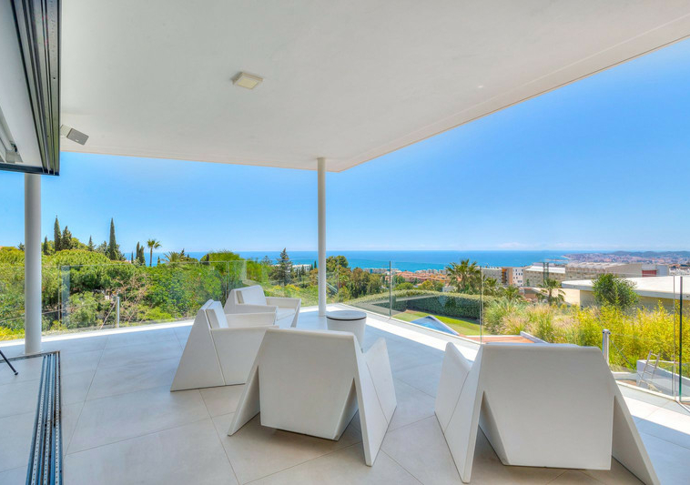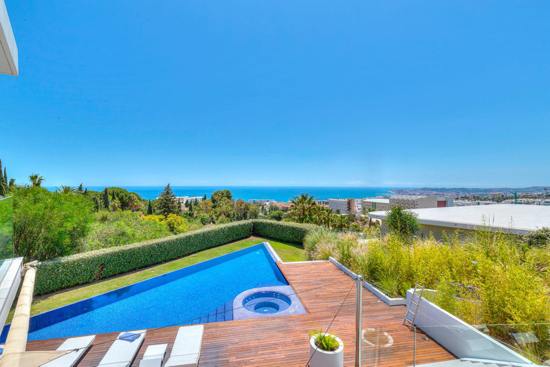Moderna villa diseñada por un arquitecto, con impresionantes vistas panorámicas al mar. La villa consta de dos niveles, con la entrada principal en el nivel superior. Desde el momento en que entras por la puerta principal, puedes disfrutar de la fantástica vista gracias a las puertas de cristal, de suelo a techo, que corren a lo largo de la fachada de la villa. La planta superior se caracteriza por ser un espacio abierto que alberga una isla de cocina, muebles de cocina integrados, zona de comedor y un conjunto de sofás. En el centro se encuentra una vinoteca de cristal. En la misma planta hay un aseo para invitados, además del dormitorio principal con baño en suite y vestidor privado. Saliendo al exterior, hay una maravillosa terraza cubierta que da a un porche de madera y césped. Desde el suelo de madera una escalera de tres metros de ancho baja a la piscina de 67 m2 con jacuzzi. Los dos pisos de la casa están conectados por la escalera, especialmente diseñada, que es la joya de la casa. En la planta inferior hay cuatro dormitorios, cada uno de ellos cuenta con baño en suite de paredes de cristal, un aseo de invitados, una sala de televisión con una pequeña cocina y chimenea, un lavadero y un amplio garaje doble. Tres de los cuatro dormitorios y la sala de televisión tienen acceso a la terraza de madera junto a la piscina donde, además de espacio para tumbonas y mesa de comedor, hay una cocina exterior, barbacoa y aseo, todo ello protegido por toldos de velas enrollables. La villa está equipada con aire acondicionado, suelo radiante, alarmas, cámaras de seguridad, domótica, etc. La villa está ubicada en una de las mejores parcelas de la exclusiva urbanización Reserva del Higueron, en el límite entre Fuengirola y Benalmádena y, solo 15 minutos, del Aeropuerto Internacional de Málaga. En la zona se encuentra el Hotel Hilton, de 5 estrellas, club deportivo con gimnasio, spa, pistas de pádel y tenis y un restaurante con estrella Michelin.