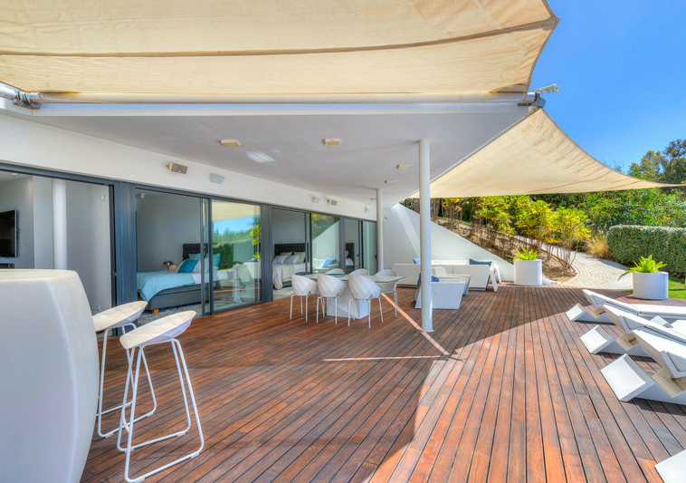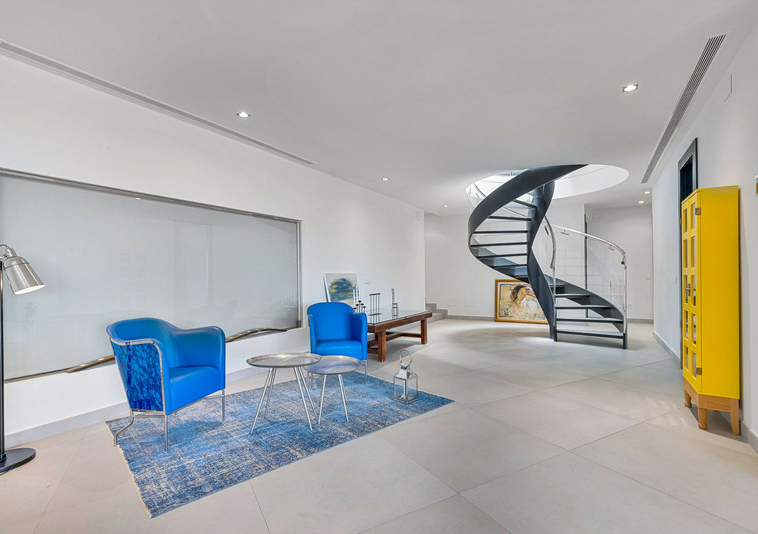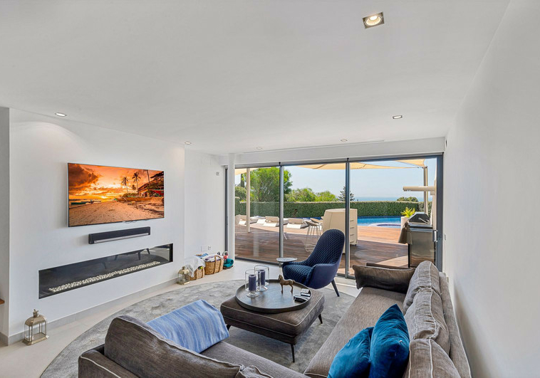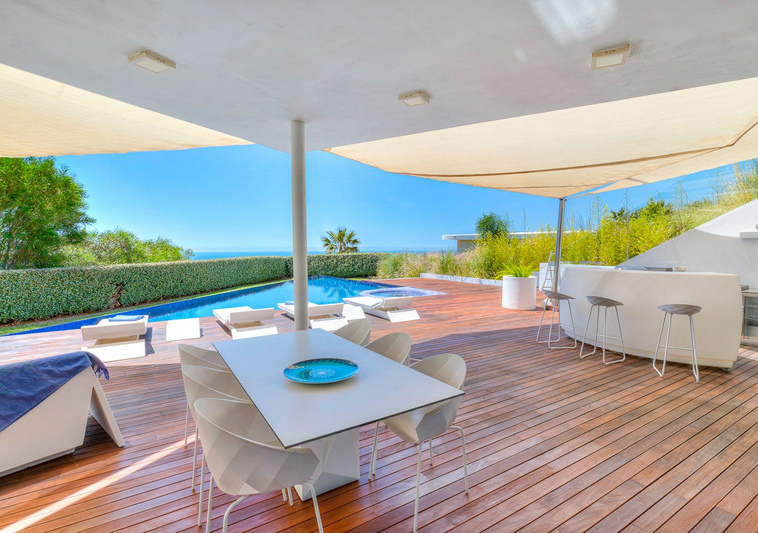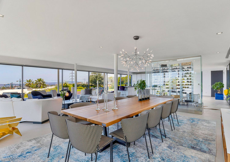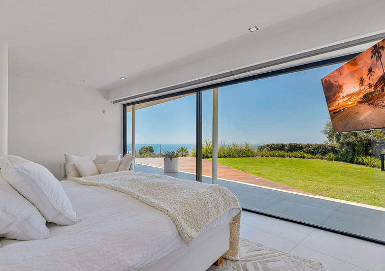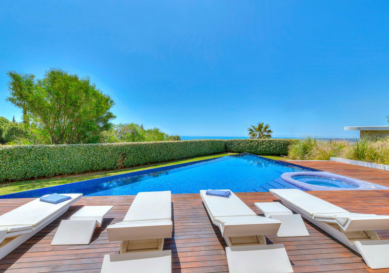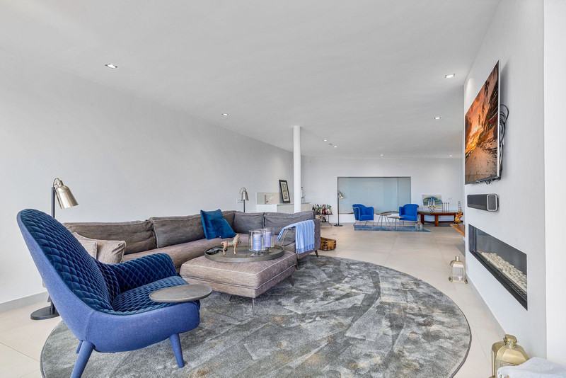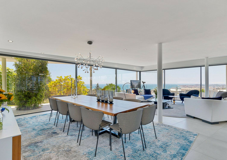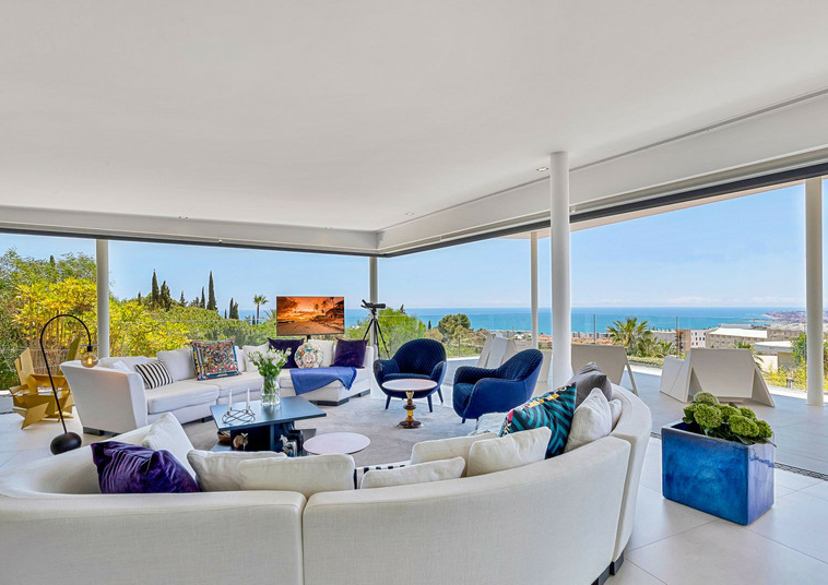 Moderna villa diseñada por un arquitecto, con impresionantes vistas panorámicas al mar. La villa consta de dos niveles, con la entrada principal en el nivel superior. Desde el momento en que entras por la puerta principal, puedes disfrutar de la fantástica vista gracias a las puertas de cristal, de suelo a techo, que corren a lo largo de la fachada de la villa. La planta superior se caracteriza por ser un espacio abierto que alberga una isla de cocina, muebles de cocina integrados, zona de comedor y un conjunto de sofás. En el centro se encuentra una vinoteca de cristal. En la misma planta hay un aseo para invitados, además del dormitorio principal con baño en suite y vestidor privado. Saliendo al exterior, hay una maravillosa terraza cubierta que da a un porche de madera y césped. Desde el suelo de madera una escalera de tres metros de ancho baja a la piscina de 67 m2 con jacuzzi. Los dos pisos de la casa están conectados por la escalera, especialmente diseñada, que es la joya de la casa. En la planta inferior hay cuatro dormitorios, cada uno de ellos cuenta con baño en suite de paredes de cristal, un aseo de invitados, una sala de televisión con una pequeña cocina y chimenea, un lavadero y un amplio garaje doble. Tres de los cuatro dormitorios y la sala de televisión tienen acceso a la terraza de madera junto a la piscina donde, además de espacio para tumbonas y mesa de comedor, hay una cocina exterior, barbacoa y aseo, todo ello protegido por toldos de velas enrollables. La villa está equipada con aire acondicionado, suelo radiante, alarmas, cámaras de seguridad, domótica, etc. La villa está ubicada en una de las mejores parcelas de la exclusiva urbanización Reserva del Higueron, en el límite entre Fuengirola y Benalmádena y, solo 15 minutos, del Aeropuerto Internacional de Málaga. En la zona se encuentra el Hotel Hilton, de 5 estrellas, club deportivo con gimnasio, spa, pistas de pádel y tenis y un restaurante con estrella Michelin.