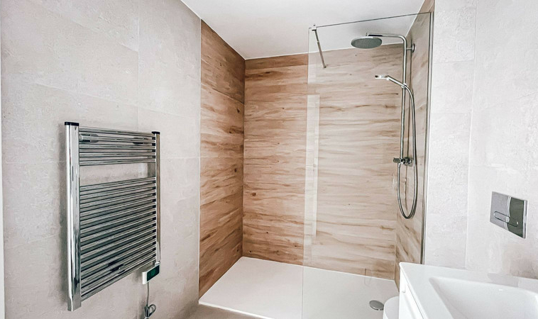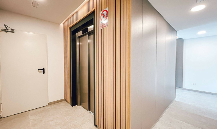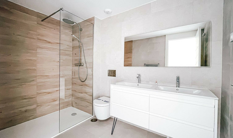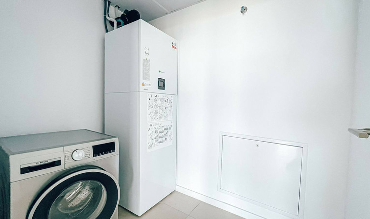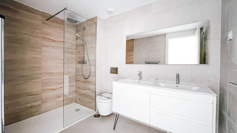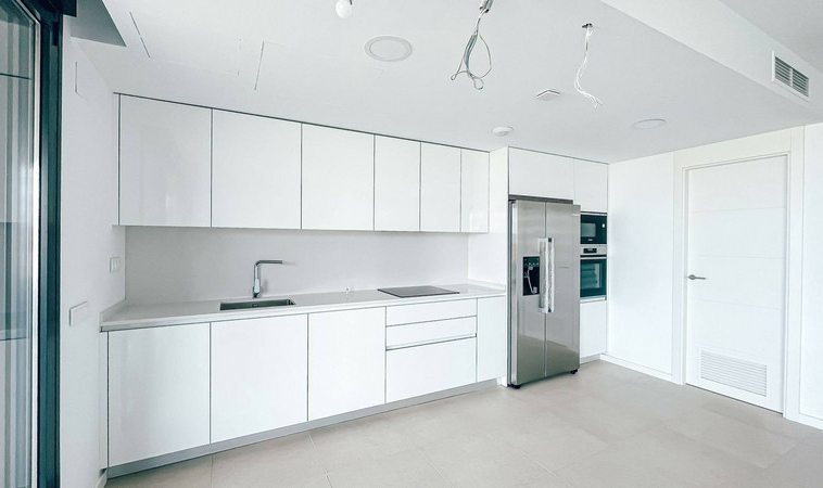 Cocina totalmente equipada con electrodomésticos Bosch, suelos de gres porcelánico, ventanas panorámicas con aislamiento térmico, persianas motorizadas y sistema de climatización por aerotermia.