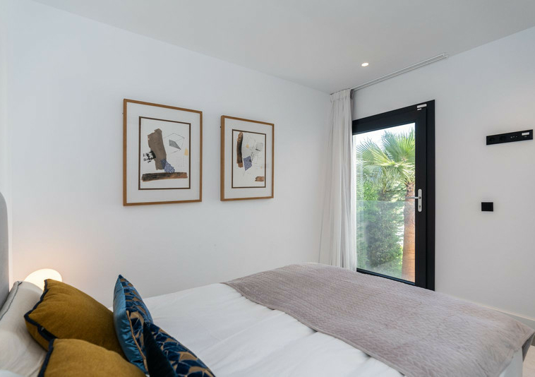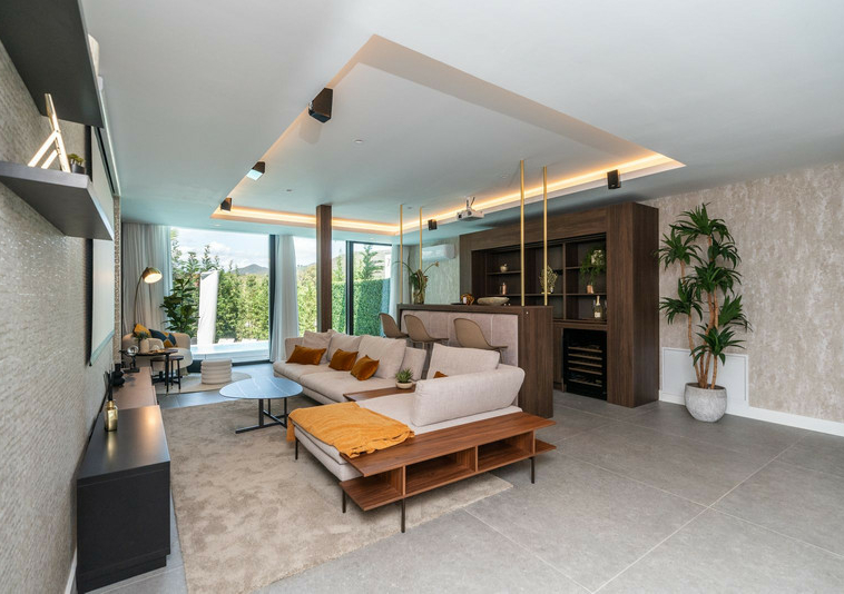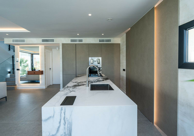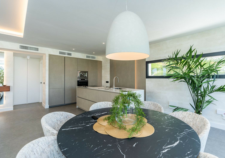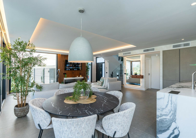 La Villa tiene salon/comedor con cocina americana en la planta baja , también en este nievel hay un dormitorio con baño ensuite. Hay un aseso también. El salon tiene acceso a la terraza cubierta con vista al jardin y piscina.